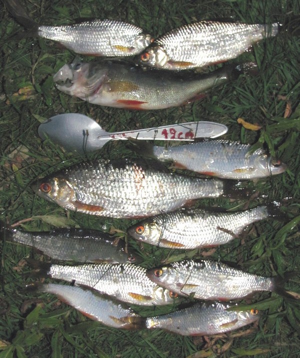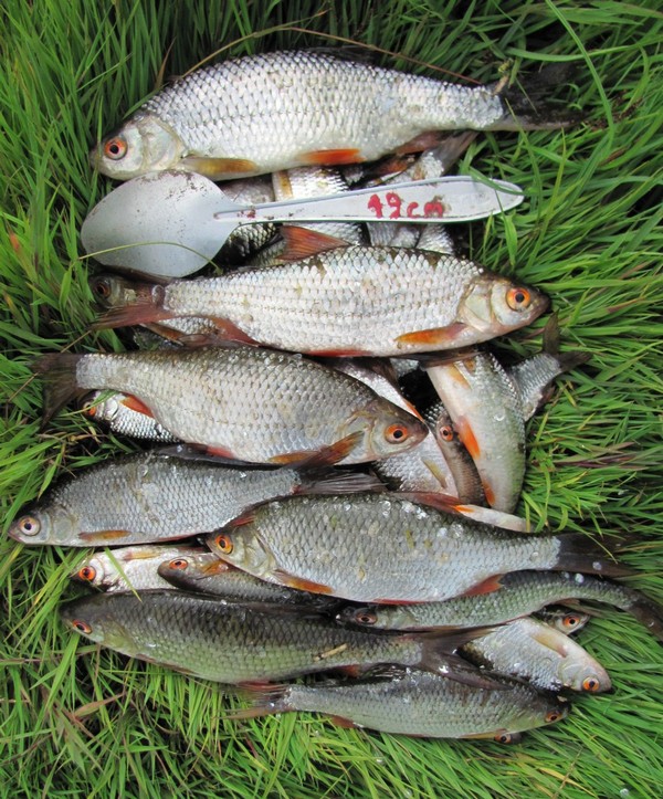 Кажется, попал. Пару подлещиков в садке. Дальше плотвина, жаль, что электронных весов не было. Её упитанность была на много больше других плотвин такой же длины, пойманных мною ранее.