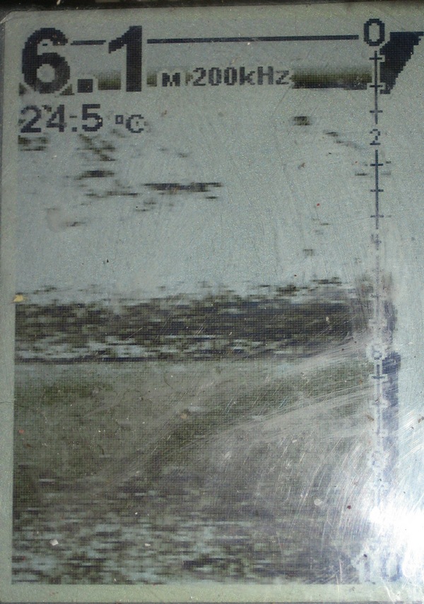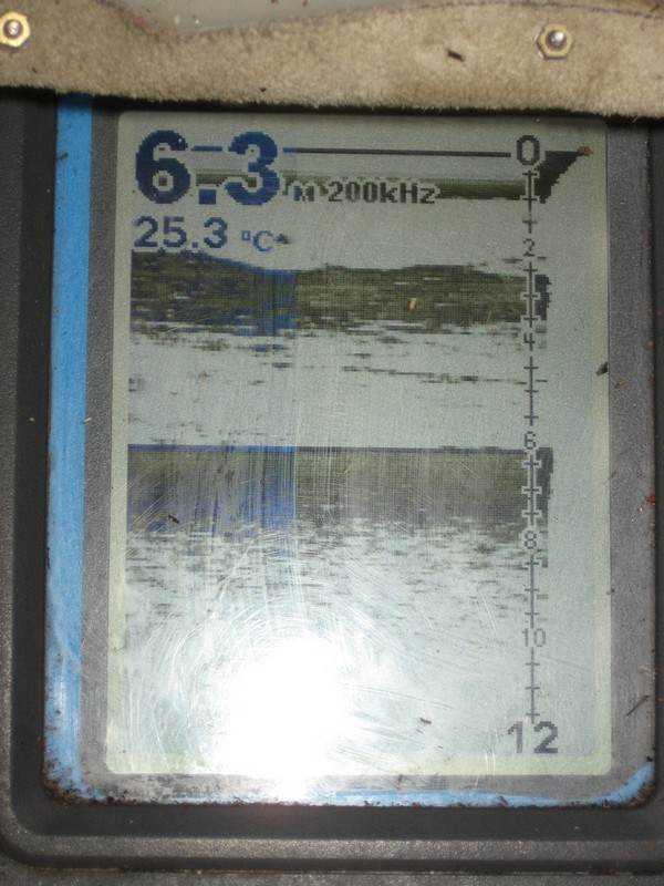 С 7 м. раба начинает появляться, и её максимум приходится на 8-9 м., по эхограмме это больше похоже на доладошечную густёрку. Вот отмель, пробую тут.