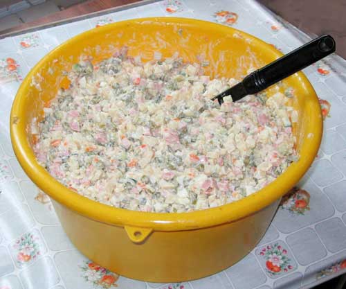 И вдруг… о счастье. КН заболевает, и на ночь приходит Артёмовна!!! Наверное в ту ночь количество людей в общаге увеличилась в трое. В ту ночь, я спустился вниз позвонить. И увидел просто замечательную картину: дверь на улицу – настежь открыта… на вахте – никого. Артёмовна мирно спит на диванчике. А на полу стоят подарки от благодарных студентов – бутылки с водкой, шампанского, лимонады, всякие закуски,. И самое запоминающееся – целый большой таз с салатом оливье!!! Нажмите на изображение для увеличения.