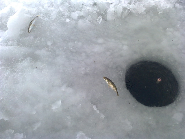 Естественно, было множество поклевок щук и окуней. Мелочь, по возможности, отпускалась, если не сильно травмировалась крючками. Клевало, в основном, на вертушки разнообразных размеров и фирм, но в фаворитах были двойки и тройки. Более мелкие блёсенки, на удивление, игнорировались белой рыбой и на них клевали вездесущие окуни и щучки. За четыре утра мы облазили все закоулки Любитова. Прозондировали семиметровые глубины джигом в надежде на поклевку сома, но не клюнул усатый, только мелкие щуки.