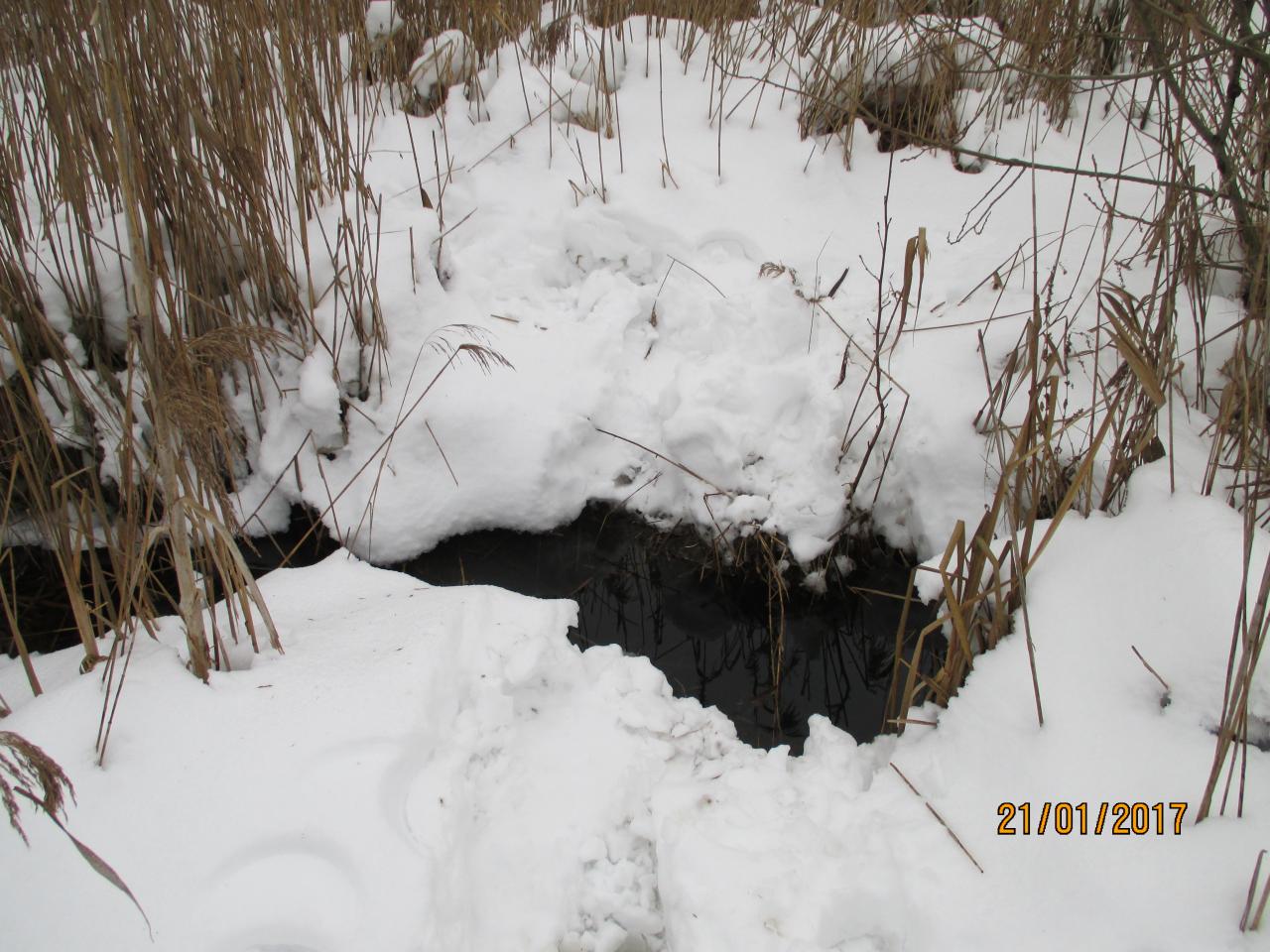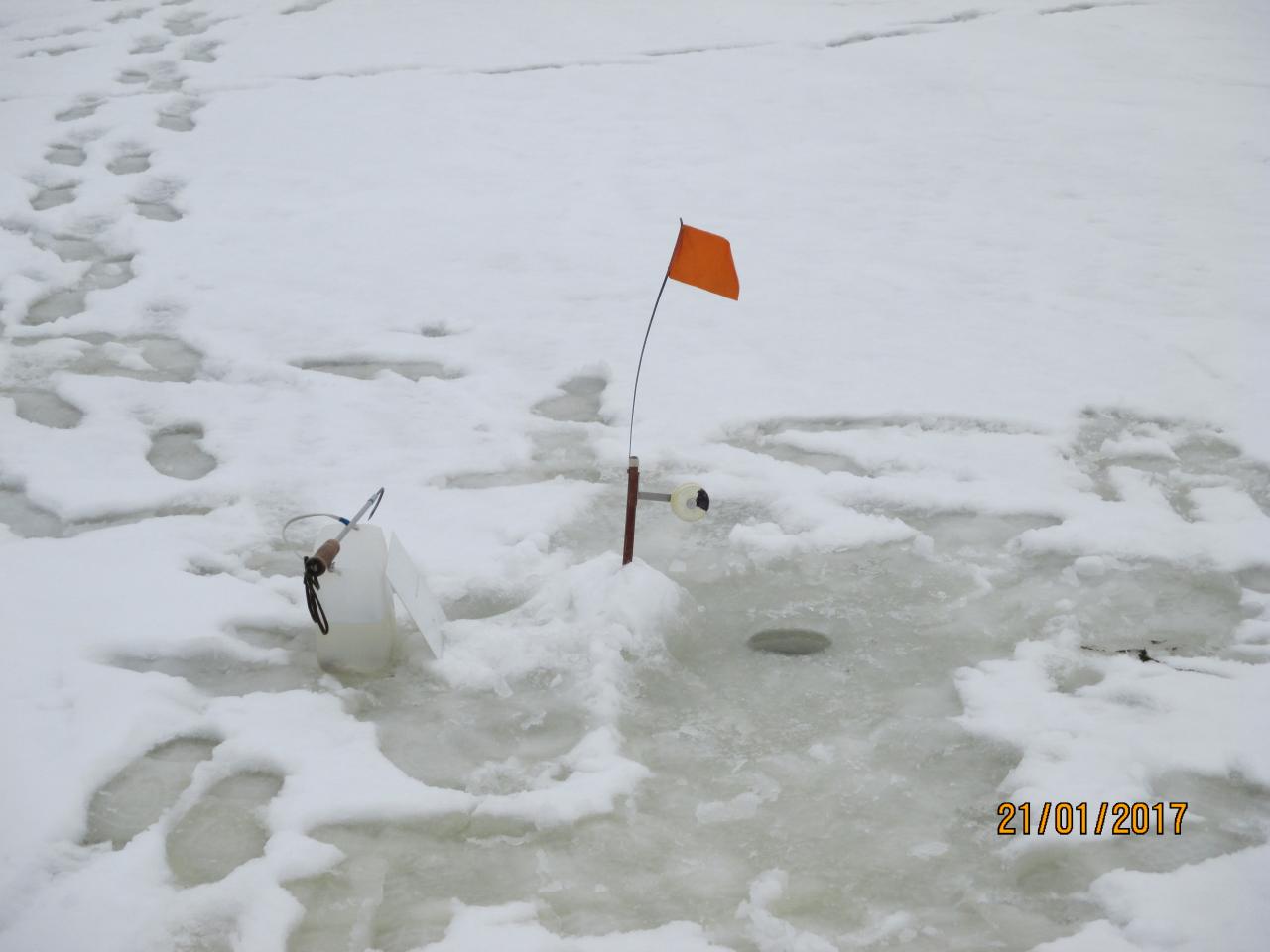 • Разливы ставки 1 выстрел, 1 на 1330гр ,балансир не хотела ,вода местами рыжая ,с запахом тины, есть затянувшиеся промоины,лед двойной, корка держит ,но по трости проваливается ,началась продуха ,по промоинам следы браков.