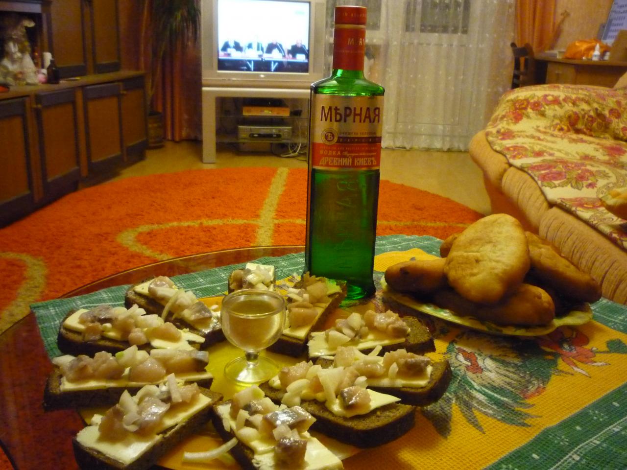 Хлебец с каляндрой сельдью и лучком и мамины свежеиспеченные пирожки с капустно-грибной начинкой и рюмочкой холодной беленькой, чем не хорошее окончание дня
