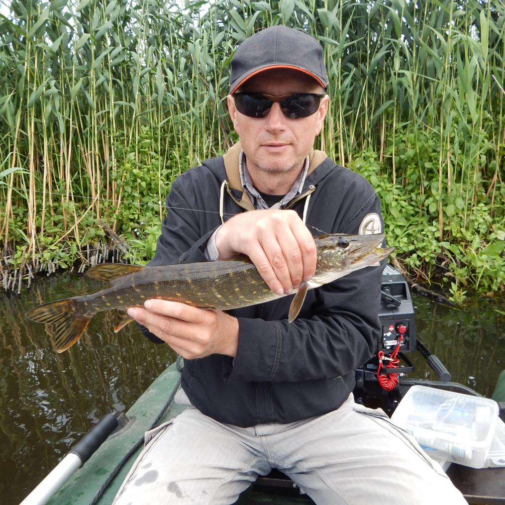 ... Через какое-то время ещё один еле слышный тычок с лёгкой придержкой ощутил. И - ничего... После обеда вновь случилась осторожная, слабая поклёвка. Но увы, закончилась досадным сходом килограммового щупачка под самым берегом. Затем долгий промежуток тишины. Несколько расцветок риперов поменял, парочку воблеров опробовал, хотя и не люблю на них ловить, - всё ноль да ноль... . Вернулся к старому: красная спинка, жёлтое брюшко. И всё-таки увидел ещё одну поклёвку. И дажё реализовал её. Небольшой щупачок, но на безрыбье и рак рыба. А напоследок в течение четырёх забросов видел каждый раз нападение на риппер окушка грамм на сто пятьдесят. Выскочит из под берега, уцепится за хвост резинки, чуть протянется, и сходит... интересно:)...