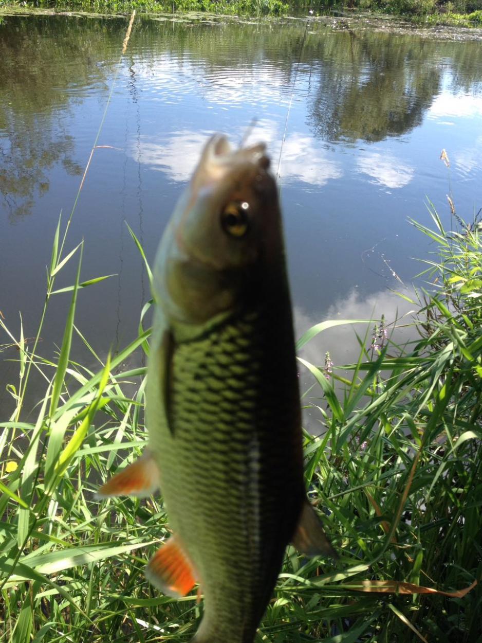 берегах реки, кусты , крапива, комары, и все это старается или укусить, или поцарапать. Нашёл ямку род 2.5 около моста, бросил прикорм, жду. Минут через пяток подошла уклейка, потом промелькнуло несколько хороших рыбин, сразу подумал чехонь' но после поклевки, и небольшой борьбы, на берегдостал первого голавлика, грамм 300-350, потом одного поменьше' потом уклейка,