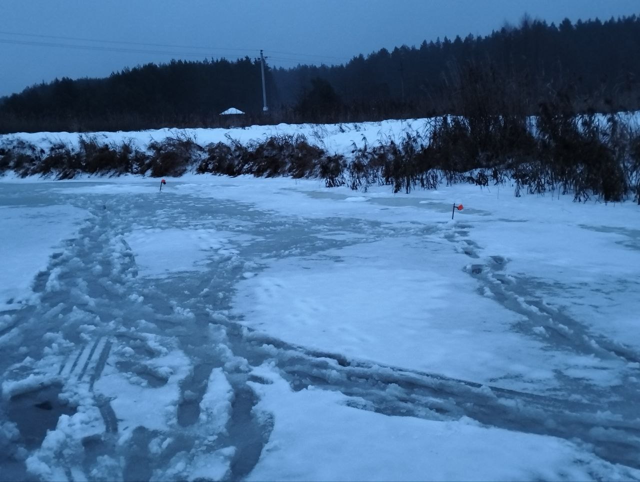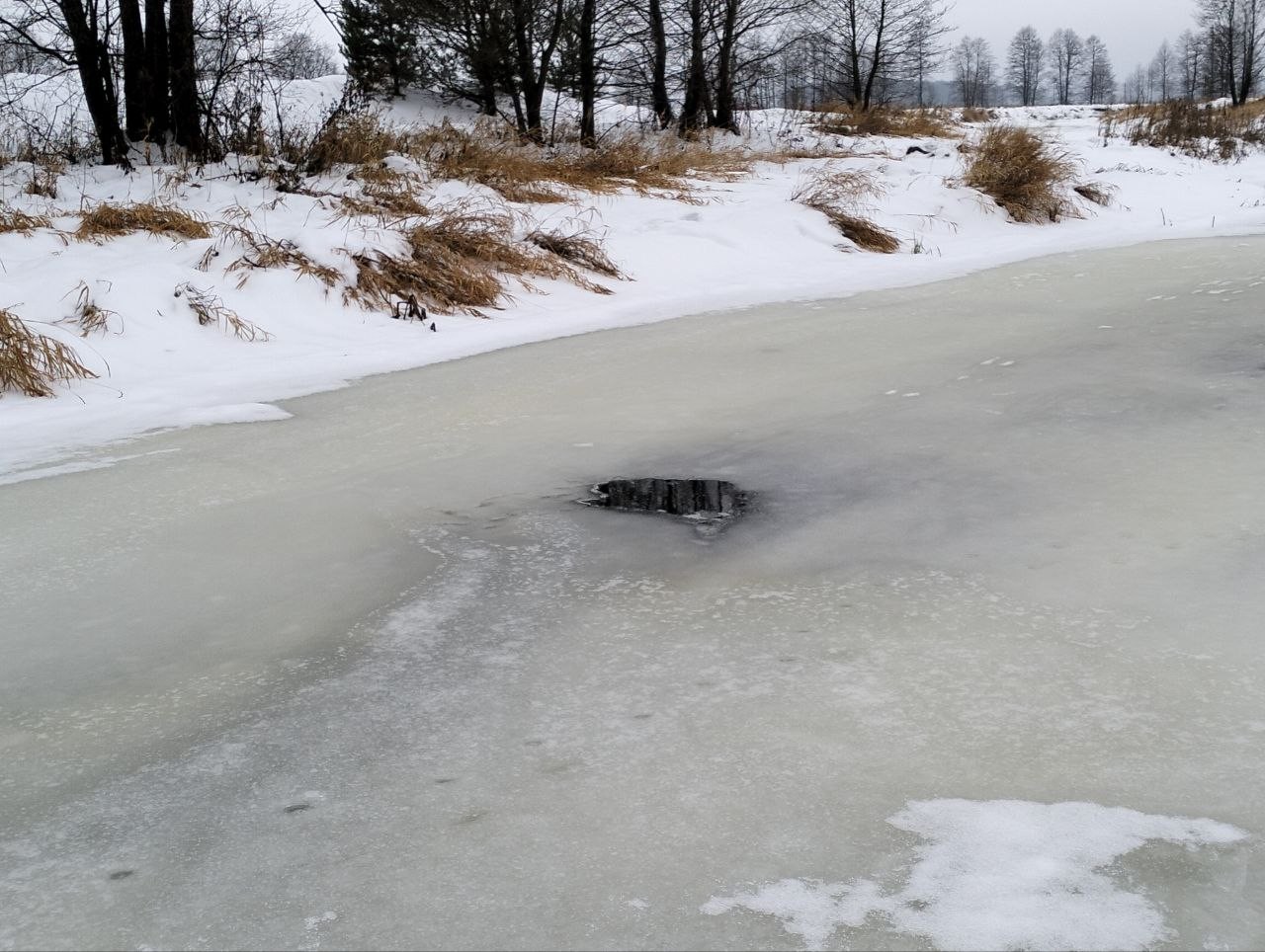 По приезду на место выяснилось, что вода в реке поднялась, и пошла в старик. Лёд у берегов сильно подмыло, зайти нельзя. Обнаружили переход из веток, который кто то из рыболовов сделал накануне и с осторожностью зашли на лёд.