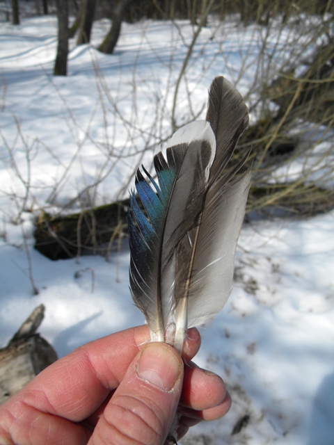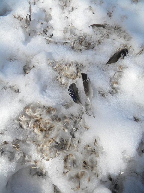 Недалеко от места встречи с удачливой рыбачкой, обнаружил место расправы над уткой(наверное). Грешу на тетеревятника, видал их тут.