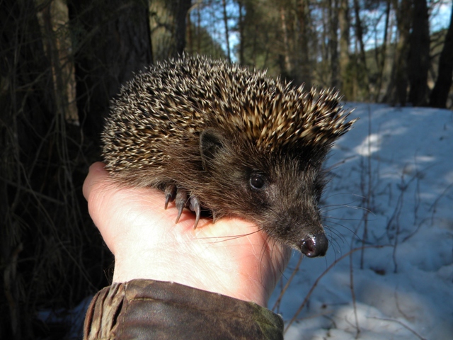 Под сосной, возле тропы, нашёл ёжика. Он ещё в "коматозе", поэтому даже не пытался свернуться в клубок. Просто сидел и пыхтел:D