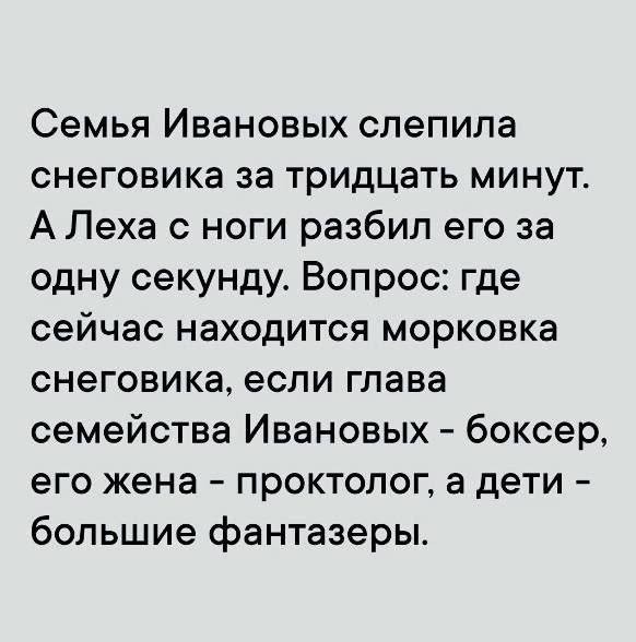 Из воспоминаний. В середине 90-х вечером во дворе лепили снеговика. Мне около 35. Детей со двора собралось примерно 10-12. Прекрасная погода, мягкий, пушистый снег, все румяные... Смех. Еще взрослые подтянулись. Все это время непроизвольно наблюдал за окнами дома, веселье же, ну... приходите!!! в одном из окон увидел пацана, лет 11. Слепили снеговика, морковка, ветки вместо рук, все дела... Разошлись по домам. Через полчаса выглядываю в окно. А уже около 23.30. Вижу, крадется тот пацан, и с ходу разваливает снеговика. А около подъезда стоит его папан и наблюдает. Жаль, что морква была всего одна))))) Так и не решил кому. Да и устал уже. Но осадочек остался. Через месяцок папан бегал по подъезду с просьбой прикурить авто. Так и не прикурил. Видимо не только у меня были претензии.