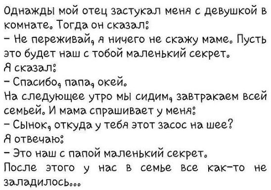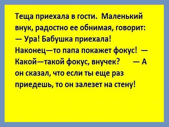 Жена долго упрашивала, чтобы я тёщу стал называть мамой. В конце концов, я сдался. Теперь спим с женой в разных комнатах: на сестру не встаёт...