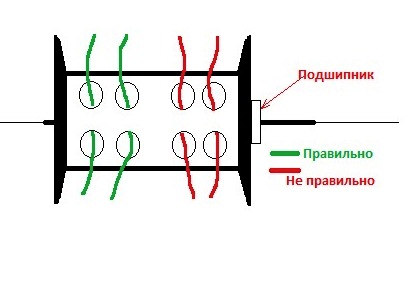 Продеваю в дырку в шпуле (по центру), потом в перегородку (шпули и оси) что бы завести на другую сторону, делаю петлю и надеваю на ось. Затягиваю- ничего нигде не трет, стоит мертво и без лишних вые*онов. Глазок предварительно тоже на середину ставлю и наматываю.