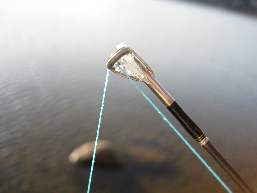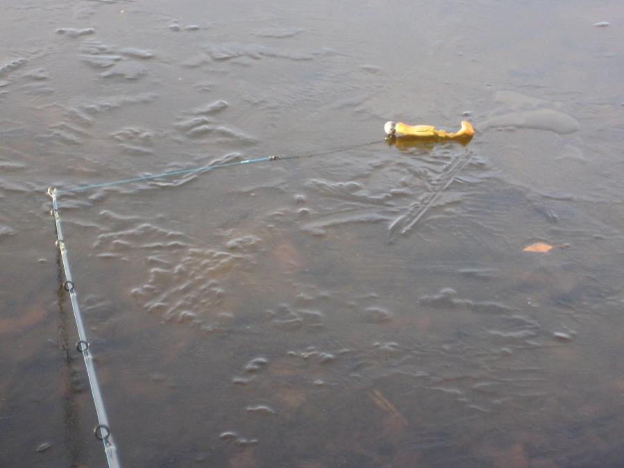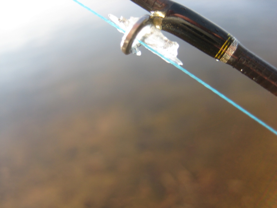 Выехал сегодня на воду снять зуд. Светило солнышко но оказалось, что температура отрицательная. Около берега лед. Кольца обмерзали моментально, проводку можно было сделать только опустив тюльпан в воду, шнур даже в шпуле замерзал. Короче помучавшись полчаса, ничего не словив и слегка подмерзнув было решено ехать домой.