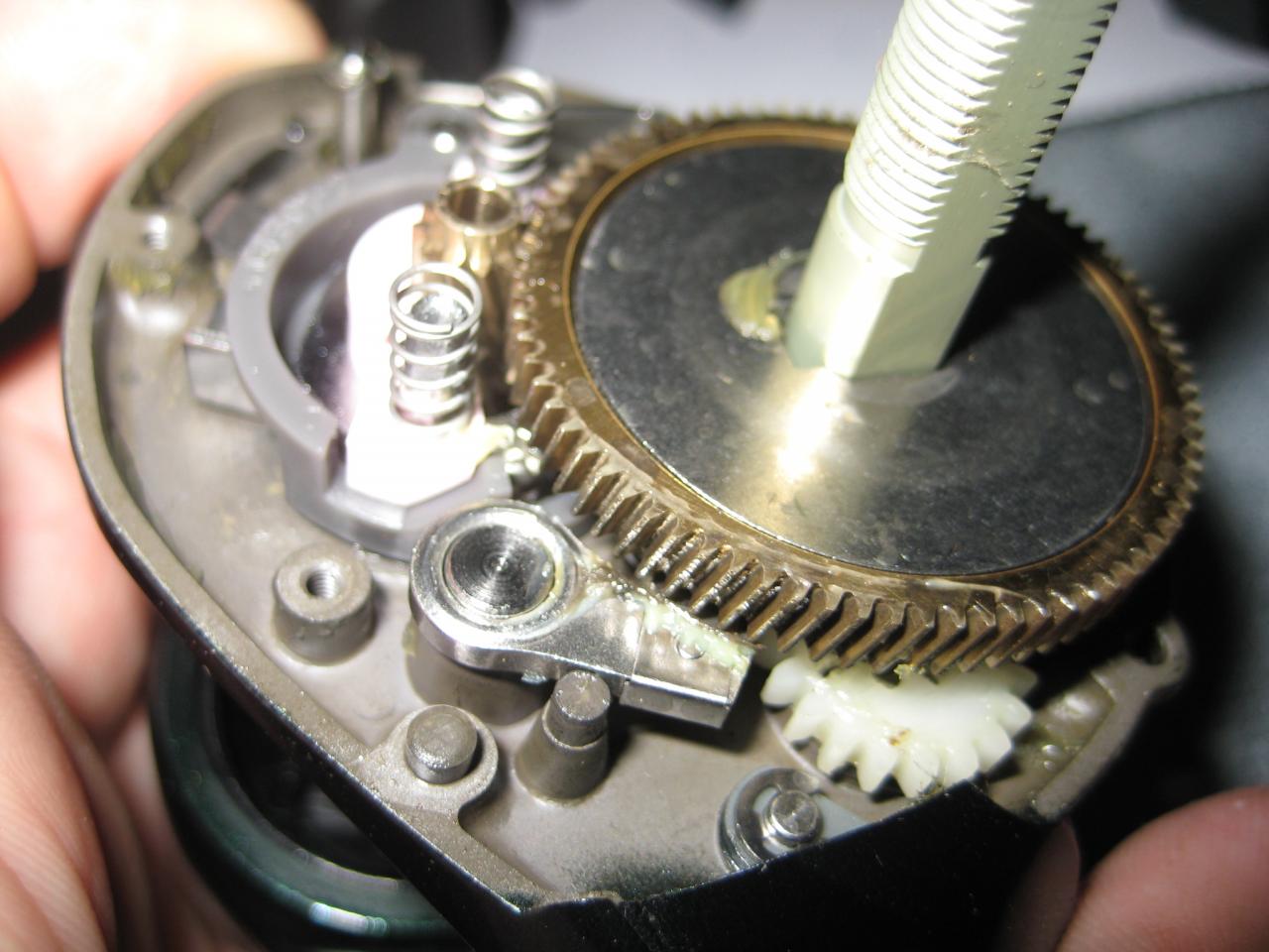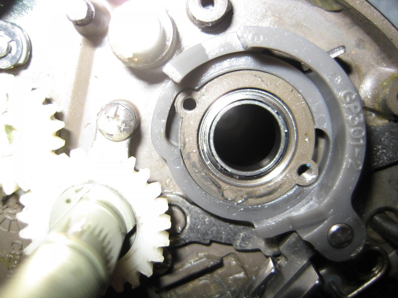 Вот на фото Шимано Курадо 201G7 обрати внимание в редукторной крышке отверстие по диаметру соизмеримо с диаметром оси, а на второй фото пиньен по высоте равен с большой шестерней (вровень) думаю понимаешь, что опоры он со стороны блока осевика не имеет. На третей фото видим опорный подшипник пиньена (вот его кстати в DAIWA AIRD 100HL нет)