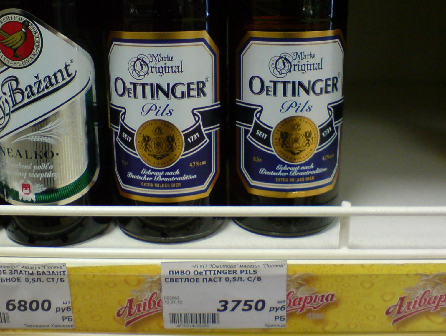 У нас оочень долго стояло Оттингер 1,5л за 8 примерно.Сегодня 0,5 стекло 3,6% по 3400.И не хапают.;)4,7 уже за 7. ...Есть ещё варианты пивасиков,берут немного,но,в основном - киснет...