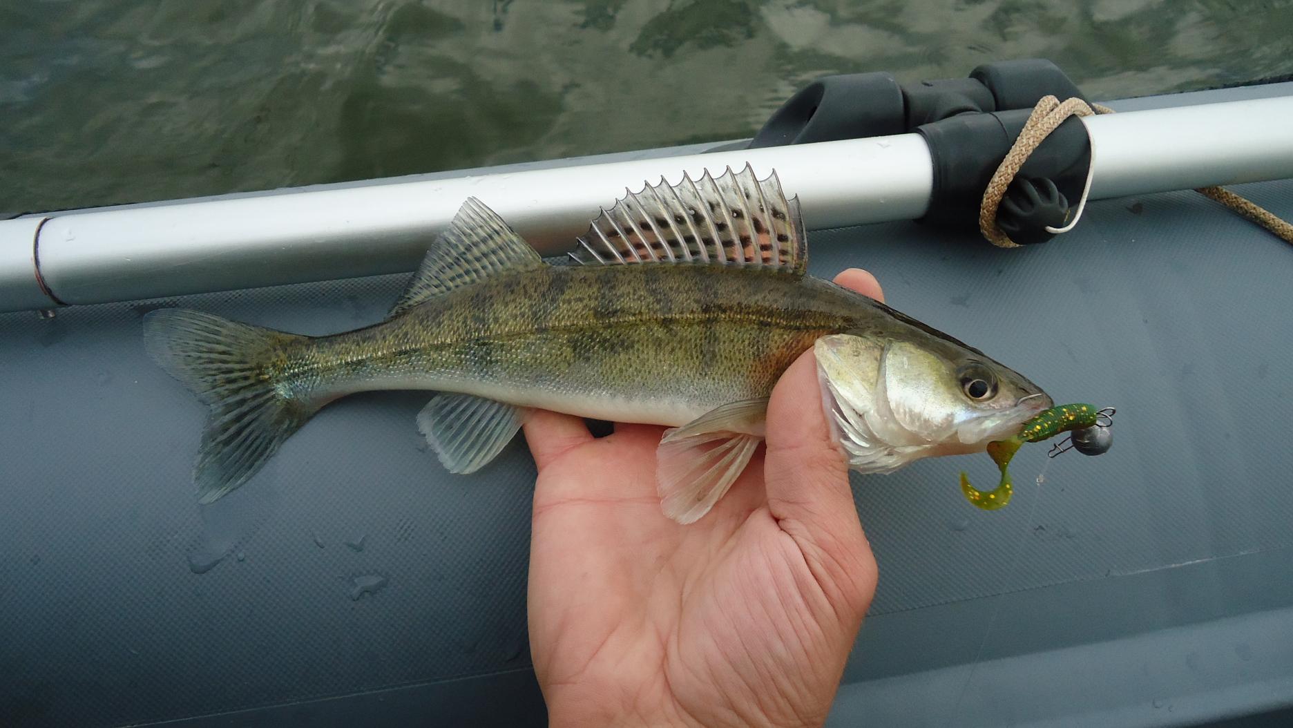 Перемещаюсь вокруг этого места, пару якорей пустые, затем ловлю незачетного окушка. Немного в стороне по эху замечаю стайку бели, становлюсь рядом. Дно интересное, небольшие перепадики, ракушечник пятнами... Продолжаю чесать тем же басс асасиным. Не знаю, что сработало, то ли вера в приманкку, то ли просто рыба активизировалась, но на очередной проводке хороший тук под лодкой. Вроде бы окунь, и очень даже зачетный, зажрал почти целиком. Радости полные штаны, звонок Володе, 36 сантиметров. Оказывается сегодня это первая зачетная рыба. Вот это расклады. На следующей проводке ловлю еще одного зачетника - 26 см. Опять звоню, Володя говорит, лови судака, кули твои окуни, окуни уже были а судака в бассейне так никто и не увидел. Ну-ну, лови... До финиша остается примерно час. никуда не перемещаюсь маслаю дальше... минут 20 без поклевок, затем в полдистанции долгожданный удар, но не засекся... Дрожащими руками бросаю в том же направлении, и через три проводки уже ближе к лодке очередной хороший тук... Есть, точно судак, и вроде как на мелюзга. Подвел к подсаку, приманки не видно, взял взаглот. Наглаз вроде зачет, меряю, 53 см. Тут уже совсем счастливый звоню Володе и говорю, что его просьба выполнена:D Поклевку до конца ловли видел еще одну, скорее всего судаковую, и одного маленького окушка доловил... Все финиш. На берегу мои радостные опасения подтверждаются. Сжалилась надо мной Мать-моржиха, подарила мутноглазого...