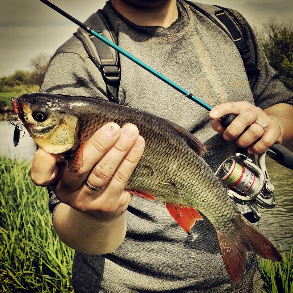 Река и местность красивые. Уже поостыв, без надежды на трофей, не спеша идем вниз по течению, наслаждаемся проснувшейся природой. Облавливать такую реку легко. Из каждого омутка выдергиваю одного-двух ладных окуней, приятно. Ловлю только на блесны. Экспериментирую с последними приобретенными вертушками Лохматого. Подхожу к неглубокому прогону с лопухами на дне. Заброс поперек течения, дно хорошо просматривается, веду блесну максимально медленно, то приподнимая над лопухами, то опуская ее в ямки. И тут, приподнимая блесну над одним из лопухов вижу блеснувший бок немалой рыбы, а следом слышу тугой звук зажатого фрикциона, спиннинг свернулся в баранку, течение работает в пользу соперника, но нет, не уйдешь. Язь! 900 грамм.