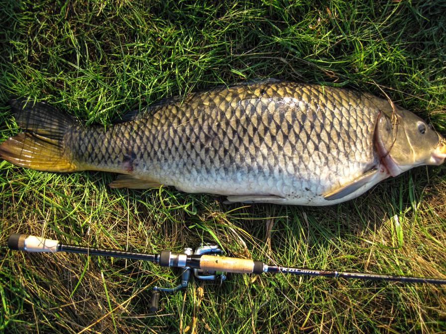 Не случалось в этом сезоне выбраться с фидером, и вот, наконец, нашел утро. Приехал, подготовился, закормил, забросил - и тишина... И так с час. А хищная мелюзга резвится прямо под ногами. Дай, думаю, погоняю её Улом... Достал, собрал, нацепил дюймового твистера "кисель" с "чебурашкой" 4 гр. и забросил. На третей ступеньке - бац! - зацеп... От, думаю, везуха, на первом забросе зацепиться. А он опа - и пошёл! И в сторону, к траве, и подальше от подсаки. Фрикцион жжжж... В общем, когда я её увидел спустя минут 10, я офигел и не поверил, что совладаю. Но как-то спокойно её подтягивал-отпускал, пока не утомил. Минут 20 провозился, аж рука заболела. Снасть - комбинированное удилище с кончиком от банакса ультры, 198, 2-8 гр, плетенка 0.08. Рыпку не взвешивал, но по длине вышла 105 см. На этом, собственно, рыбалку и закончил, ибо не фиг... :)
