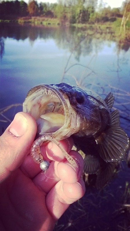 День победы - это хорошо, но единственный выходной никто не отменял. Сегодняшняя намеченная рыбалка на пригородном водохранилище обещала быть насыщена по берегу толпами бухающежарящимишашлыки отдыхающими и дабы не видеть сие безобразие забрался я на глухой пруд по соседству, потягать ротанчика. В предверии нереста "мордатый" вел себя активно, самцы уже облачились в яркие брачные наряды. Ввиду специфики водоема ловить на стандартный ротаний дроп-шот было не комельфо, поэтому использовал родную микруху с грузами 0.8-1гр и ловлю вприглядку по корягам. Резину кушал всякую от искуственного мотыля до рачков. Но предпочитал все же более "рыхлый" силикон. Стрельнул тсуникичи ворм и мося 1.5", а также неплохо себя показал пеке-пеке. Поклевок было тьма, в основном мелочь, но наблюдать тактику ротана при нападении на приманку - это шик. Самцы стараются куснуть и отогнать "врага-приманку" от себя, хватая ее поперек, из-за чего очень плохо засекались и часто срывались, а самки наоборот - зажирают и тащат под бревно. Решил перебраться в самый валежник, забрался на неустойчевое бревно, сделал заброс метров на 8 и спустя пару подрывчиков получил мощный тычок и сразу же серьезное сопротивление, результатом которого оказался бассик грамм 120, который на фоне 20граммовых головастиков показался прям-таки локомотивом. Балансируя несколько часов на скользком бревне выловил множество типаскарпен всякого калибра и еще парочку 100граммовиков, в общем: ЧЕМ ДАЛЬШЕ В ЛЕС, ТЕМ ТОЛЩЕ ПАРТИЗАНЫ.