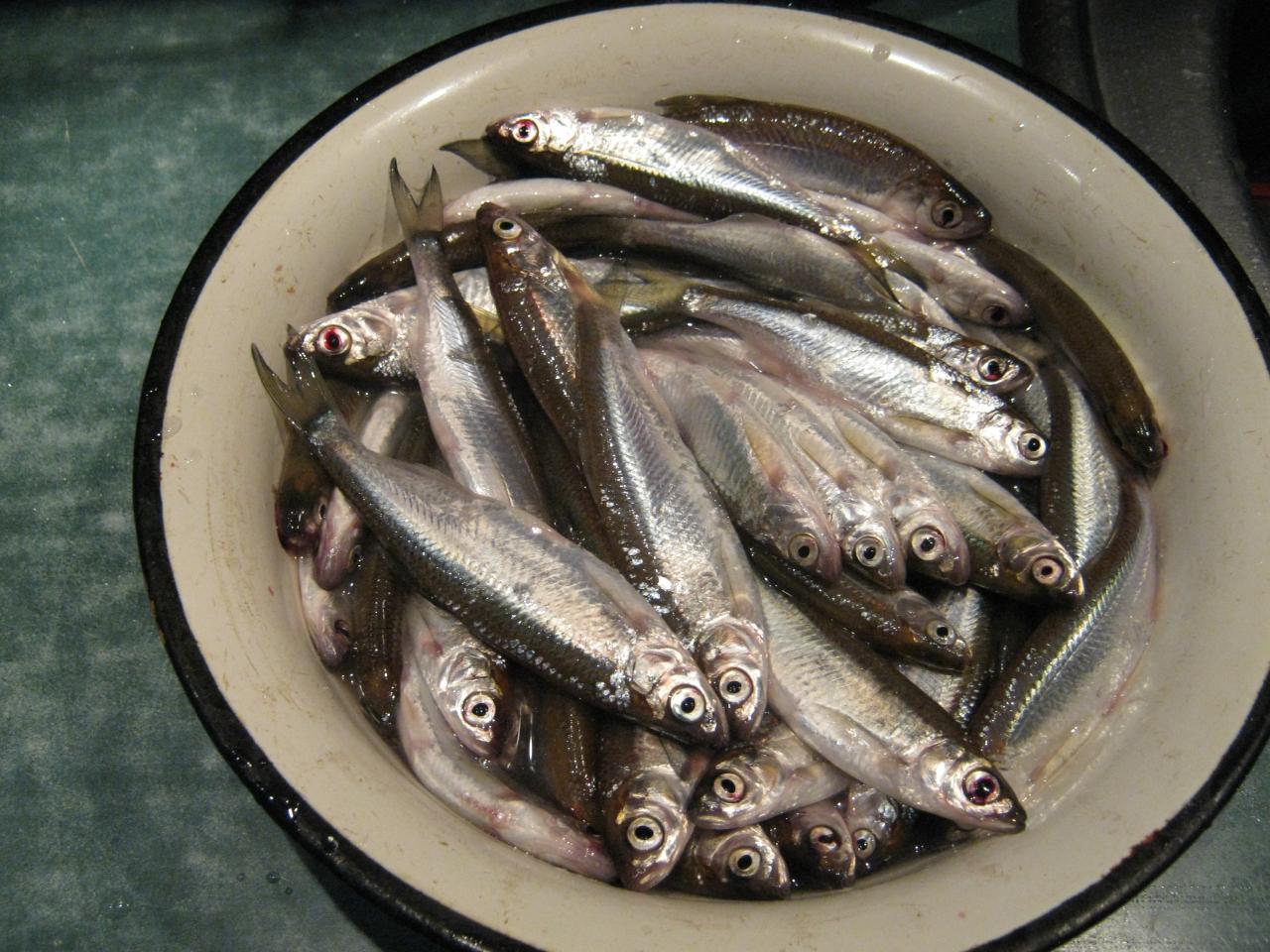 Вчера вечером в три руки часть улова была подготовлена к обжарке. Легким движением ножниц "голова -живот -хвост" наполнили кастрюльку симпатичными тушками.По минуте с каждой стороны -и деликатес готов.
