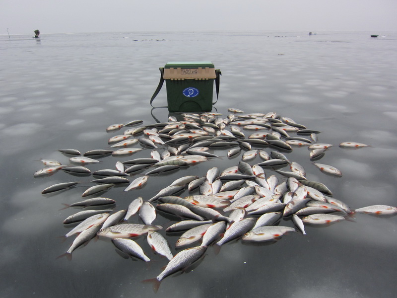 Пятница суббота....Ветвиник,первый день погодка и клев по лучьше были,на второй день приморозило,подул ветерок,народу в раз 5 по более стало,летали две падушки или мчс или погранцы,на льду не к кому не подъезжали.ходили 3.7 км,заход отличьный,и подъезд тоже.кг по 30 словили,жерлицы ставили где и ловили днем 9.7м,и живец крупноват......ноль!в субботу в 13.ч скрутились,из рыбы словил на 500г подлещика и не плохой лещара рванул кручек в лунке(первый раз за зиму багор в машине оставил): D воосновом плотка красавица %70-80 икрянка да и дорога на много лучьше стала(правда по темноте влетел в пару ям ....потерял калпак с диска) у ребенка впечатлений куча,даже глаз не сомкнул на обратном пути.широую трещину переходили по дверям,с буранов ребята переправу сделали,а сразу чуть не шухнулись....корка с верху прихватилась....