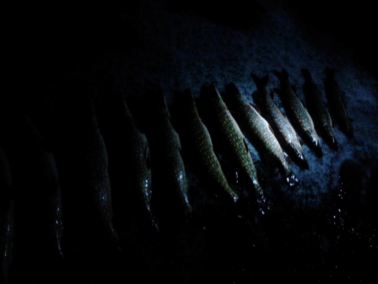 То же озеро, те же лица, только в команде замена Алекса. Долго писать не буду, рыба весь день молчала, клев никакой, балансир так же отмолчал одна поклевка шнурка и тот сошел. Митрей негодовал на это наплевательское отношение со стороны щуки. Первая поклевка на жерлицы 10.05 крайняя 10.40. Все больше ни одной сработки, ни перенос жерлиц, ни смена глубины погружения живца, ничего не дало результата. Итого домой уехало: 23 рыбины из них: 3 по 4кг, 2 по 3кг, 3 по 2-2,3 кг остальное 0,8-1,5 кг. 6 шнурков ушло подрастать.