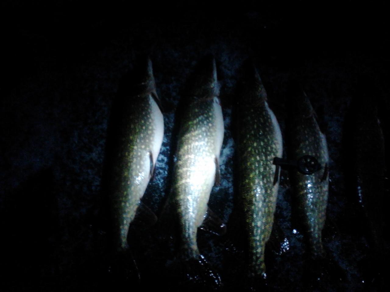 Воскресенье опять туда же. Только в экипаже с нами уже Аlex_82. Смена погоды давала шанс на клев. Уже подмечено, что тут щука любит резкую перемену погоды (во всяком случае пока было так). По писсят на берегу и в бой. Не успев до конца выставиться, чуть только начало светать, практически в сумерках, Алекс достает щучку, затем поклевка у меня с тем же результатом. В итоге минут за 40 у меня в активе 5 съедобных и одна ушла подрастать, у Алекса 2 съедобных и бонус, не дотянувший 100 гр до 4 килей.