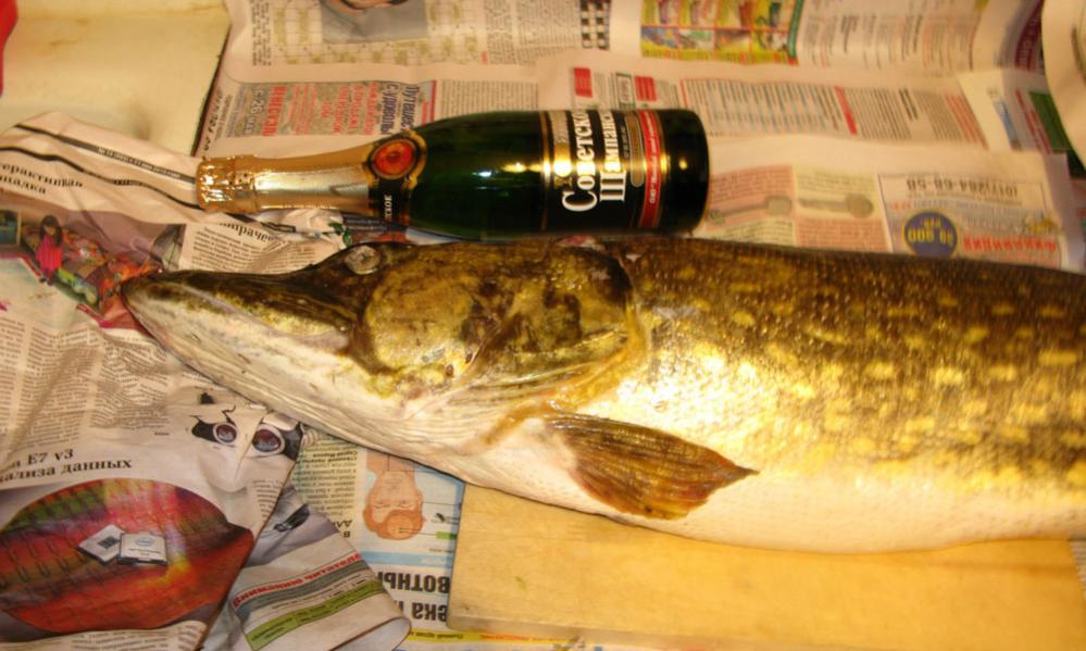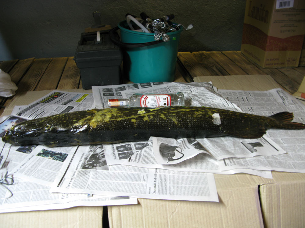 Сначала порыбачил на сравнительно небольшом озерке. Выплыл в 7 утра, поздновато, но тут же на дорожку поймал щуку под кило, а в 9 утра зацепил "крокодила" на 7,7 кило. Сопротивлялась сильно, дважды вырывалась из рук, утопила зевник (в суете не прикрепил его к лееру), разогнула один крючок почти полностью, а второй сидел совсем слабо. Крепко повезло, а такое дело нужно обязательно отметить, что я и сделал.