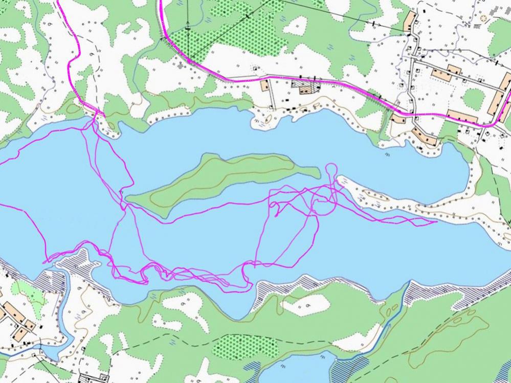 Я раскатал губу и решил, что все еще впереди... Выплыл в 5 вечера и до 9 утюжил озеро. По нулям. На скрине карты видно, что я не сачковал, а трудился как негр на галерах.