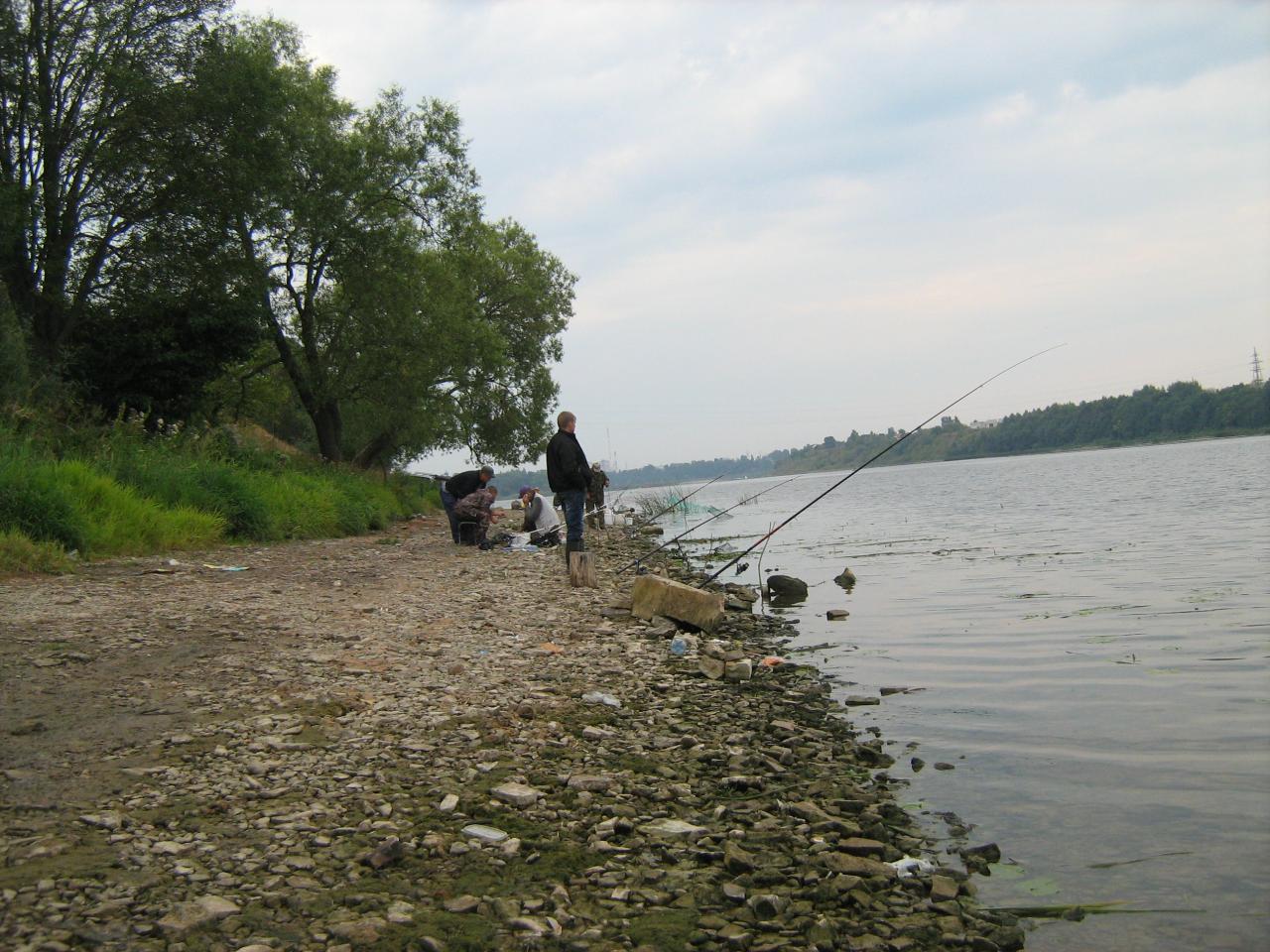 Подъезд можно сказать хороший, засыпан камнем или щебнем, немного ухабистый, но проехать можно даже на легковой машине. Есть небольшая площадка для стоянки метрах в 30-50 от берега. Непосредственно к реке имеется съезд, поэтому многие рыболовы заезжают прямо на берег на машинах. В обе стороны от съезда идет каменисто-песчанная полоса, шириной 6-7 метров, достаточной для проезда легковой машины или небольшого микроавтобуса. Также есть площадки для разворота. Река здесь достигает 200-300м, а на повороте до 400 и более метров в ширину. Глубины в русле до 9-12 метров. Свал в глубину начинается метрах в 10 от берега. Дно в русле илистое, ближе к бровке каменистое. После промера глубины выбрал две дистанции. Дальняя, куда примерно кидали все, метрах в 40 от берега (54 оборота катушки), и ближняя на границе ила и камней в 25-27 метрах ( 30 оборотов). По поводу того куда кидали все, создавалось впечатление, что это та дистанция куда они могли добросить своими удилищами, которые в лучшем случае были телескопическими фидерными, а в худшем обычными спинингами. При этом никто не выбирал ориентир на противоположном берегу, некоторые закидывали не из-за головы, а каким-то полубоковым забросом. Поэтому нередко после такого заброса рыболов собирал при выматывании еще снасть соседа, а то и двух трех. Подсекали они так, как будто хотели одним рывком выбросить рыбу на берег. Подсаком практически никто не пользовался, просто вытаскивали рыбу волоком на берег. Экипировка у большинства состояла из 1-2 удилищ, которые ставились на вырезанные тут же в кустарнике рогатки, ведерка с прикормкой и в лучшем случае маленького раскладного стульчика. Поэтому я со своими снастями выглядел на фоне других несколько необычно.