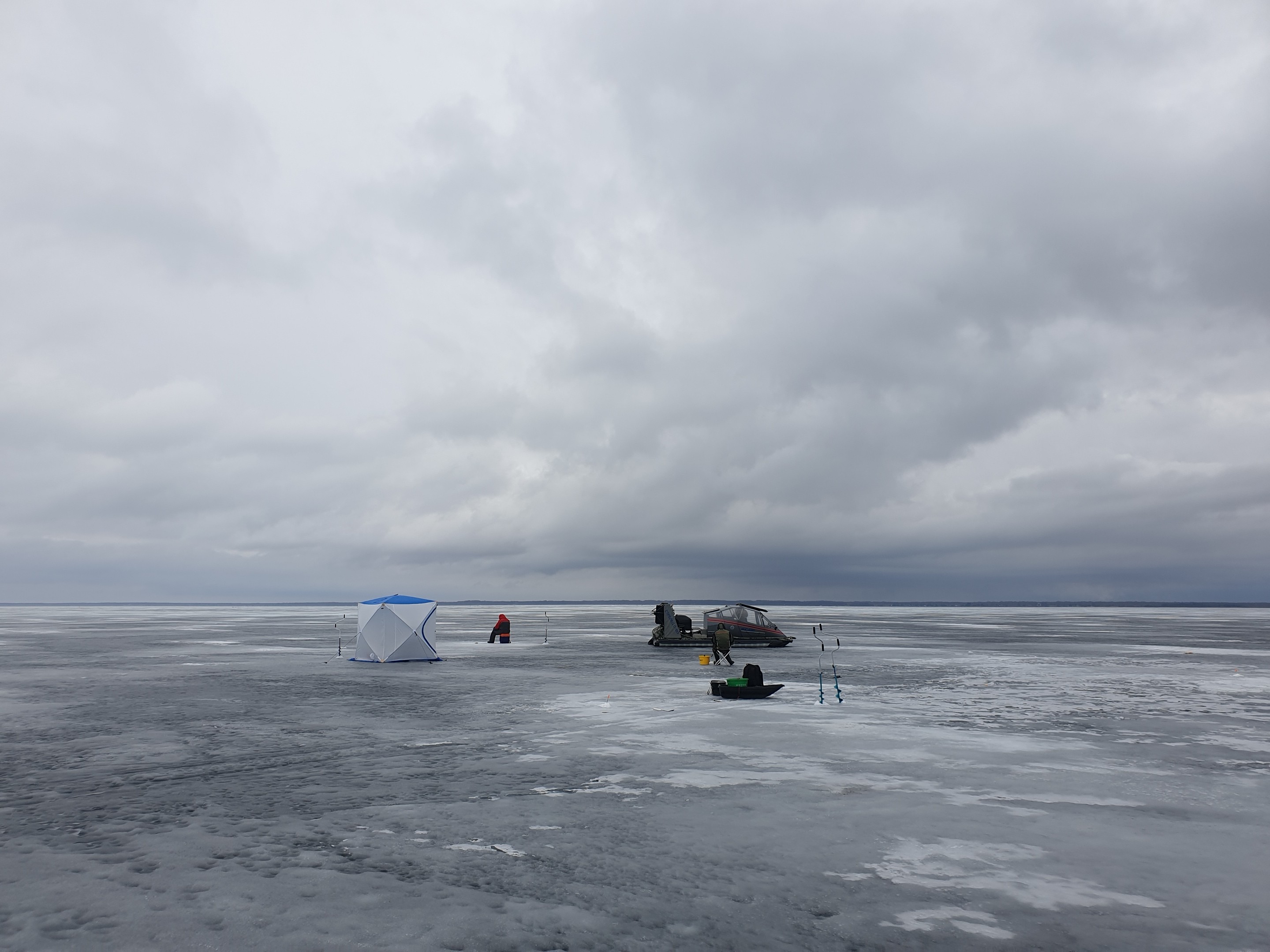 Тогда пошли дальше от берега. Впереди виделись рыболовы, к ним и пошли. Оббуривать не стали, а рассверлились метров 200 от ближайших рыболовов.
