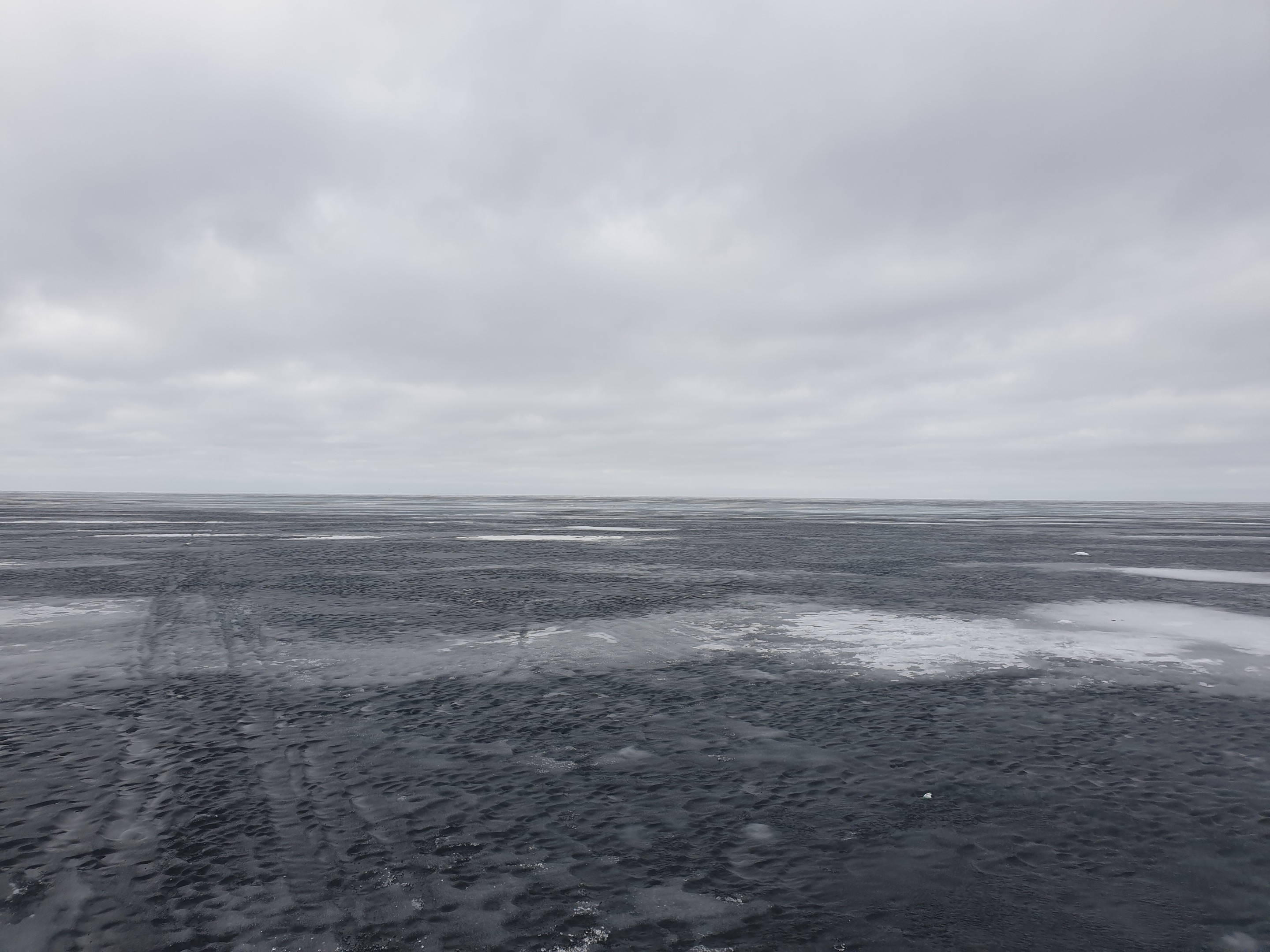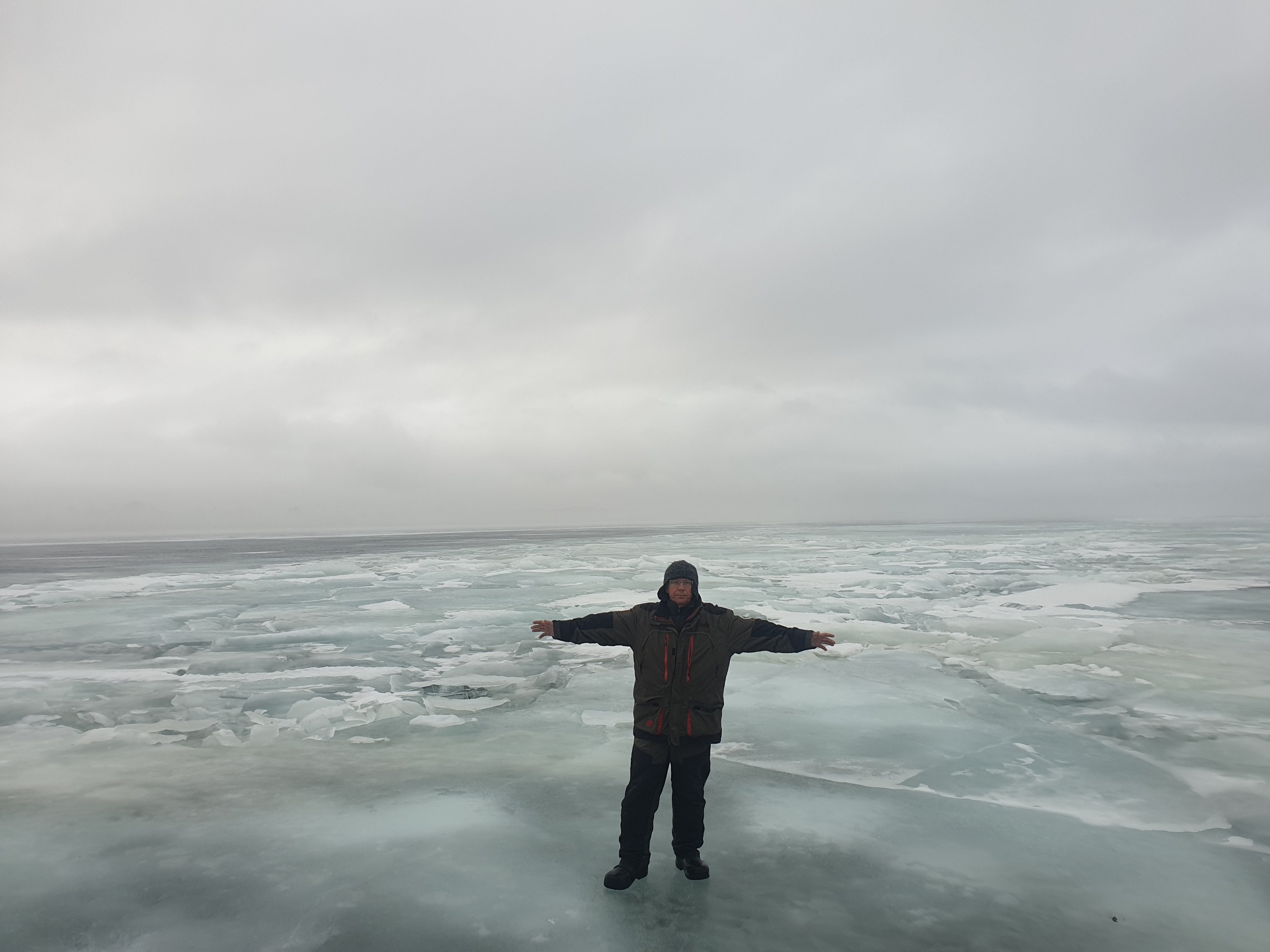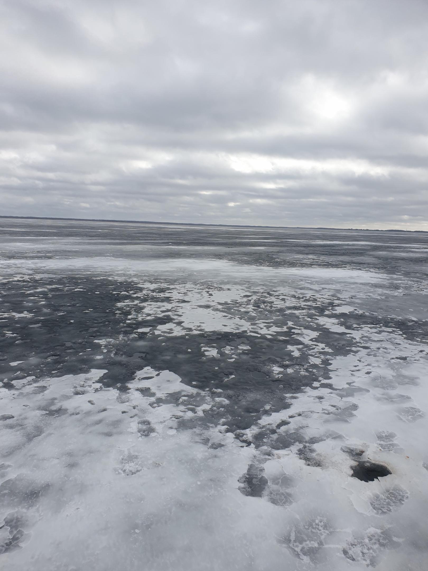 Выход на лед был 22-го ещё беспроблемным. Вышли. Осмотрелись. И пошли в бескрайние просторы Чудского озера в сторону эстонского берега, до которого 40 км.