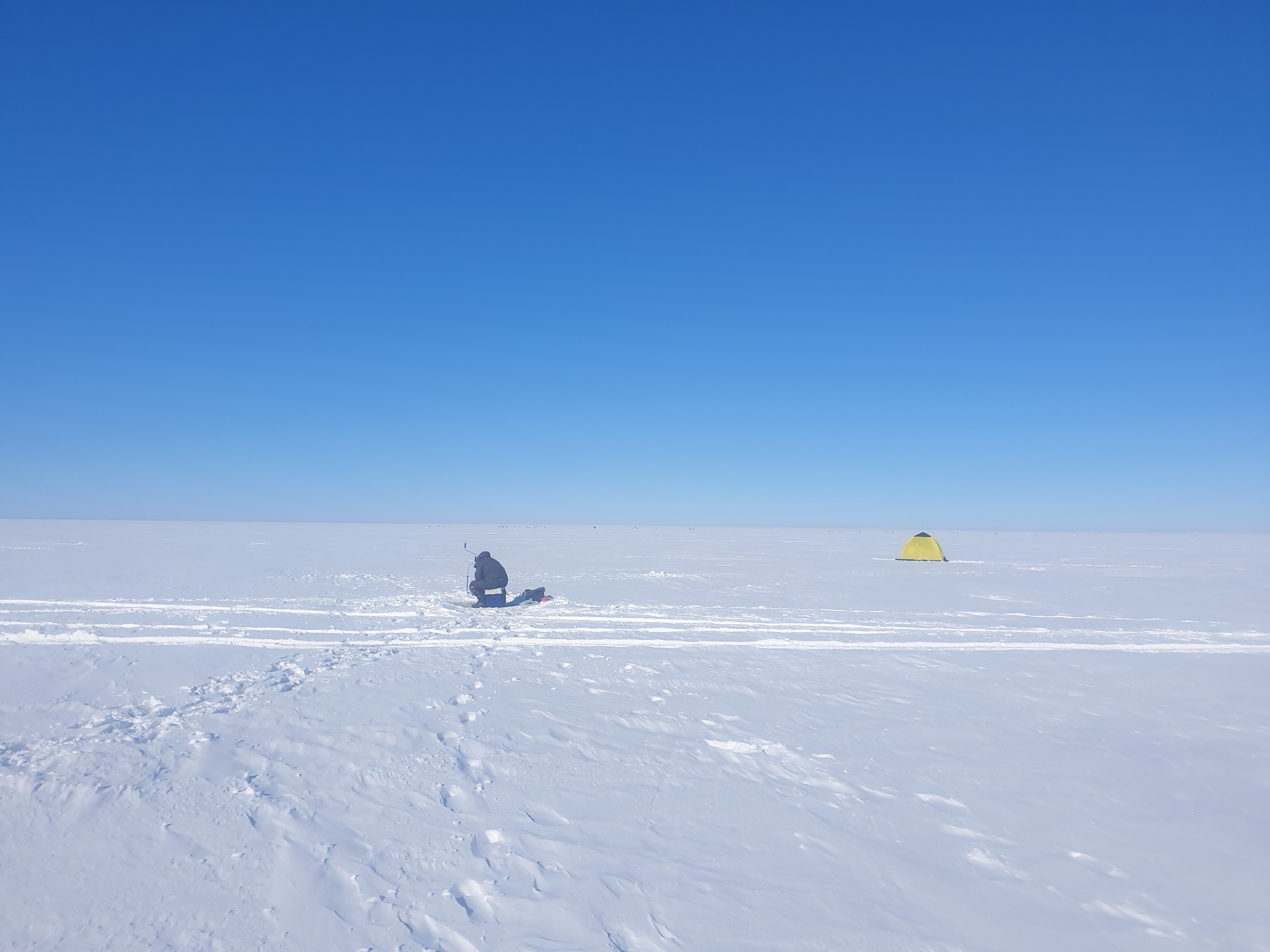 На клев не особенно надеялись, так как информация была неутешительная. Тем более после сильного ночного снегопада. Утром было 8 градусов мороза и сильный пронизывающий ветер. Приятель начал ставить палатку, так её вырвало из рук и унесло. Догнать по такому снегу шансов не было.