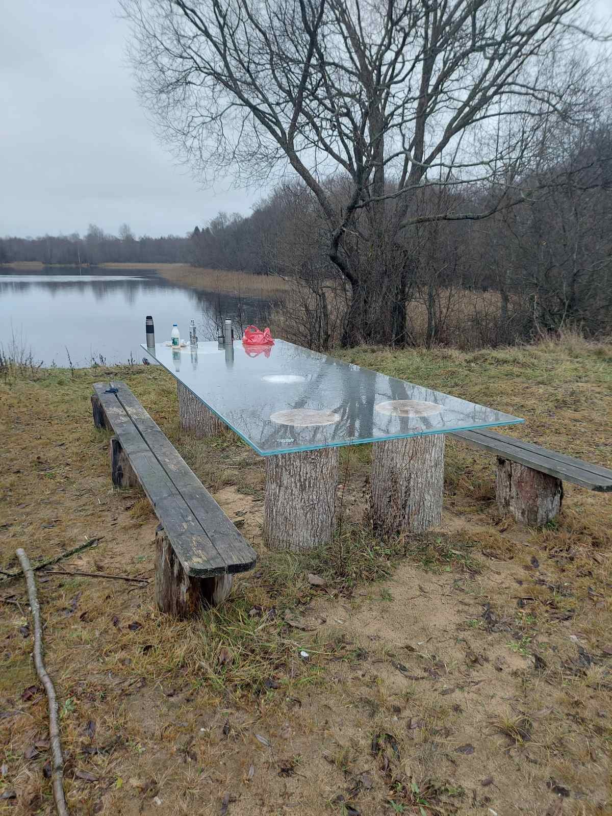 Закрывали вчера сезон троллинга на Псковщине. Прикольно ,конечно. Ночью крохотный минус,а днем крохотный плюс и вода переохлажденная. 1,2 градуса на эхолоте. С утра в затишках ледок в 1 мм .Озеро знаем, как Отче наш. Каждый уголок. И в некоторых местах этот ледок мешал.Лодка проходит легко,но треск стоит и воблер не проведешь. Пришлось ледоколить,а потом ветерок отнес ледок от тростника .А к обеду он и сам стал исчезать. Пообедали на роскошном столе. Кто-то припер на берег и установил на огромных колодах два склееных витринных стекла толщиной в 8(10?) мм каждое. За этим столиком сесть человек 15-20 может. При чем, там стоит маленький вагончик -бытовка(он там уже много лет стоит) и вокруг ничего больше нет, кроме огромного стационарного мангала и бочки с мусором. Ни стройки ,ни следов деятельности какой-то. Умом Россию не понять.