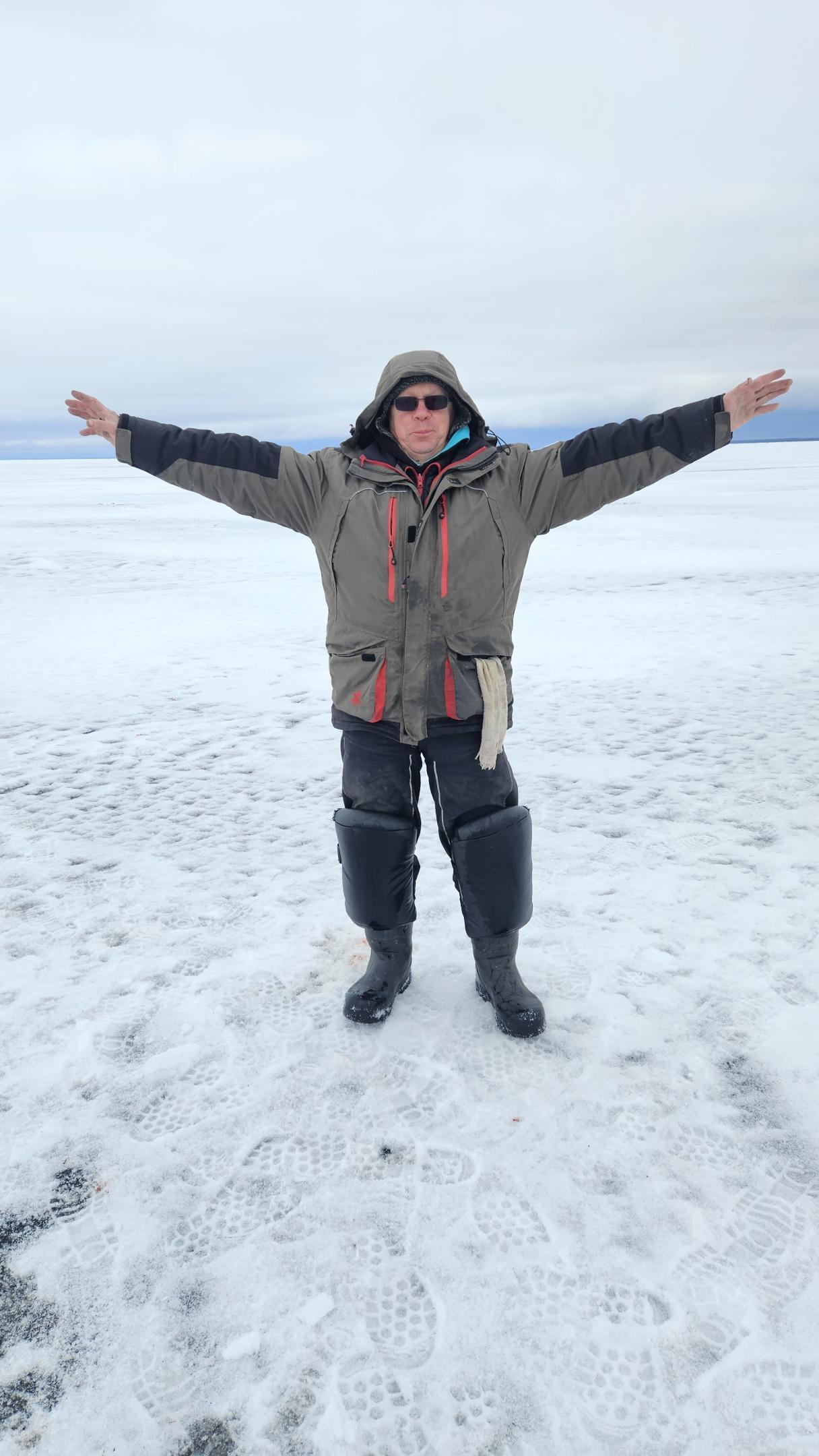 Валерий Викторович, дорогой, ушел на дальний кордон, метров на 500 от нас к центру озера, туда, где было две крупные группы рыболовов, которые приехали на мотособаках. У него там было на полметра поглубже.