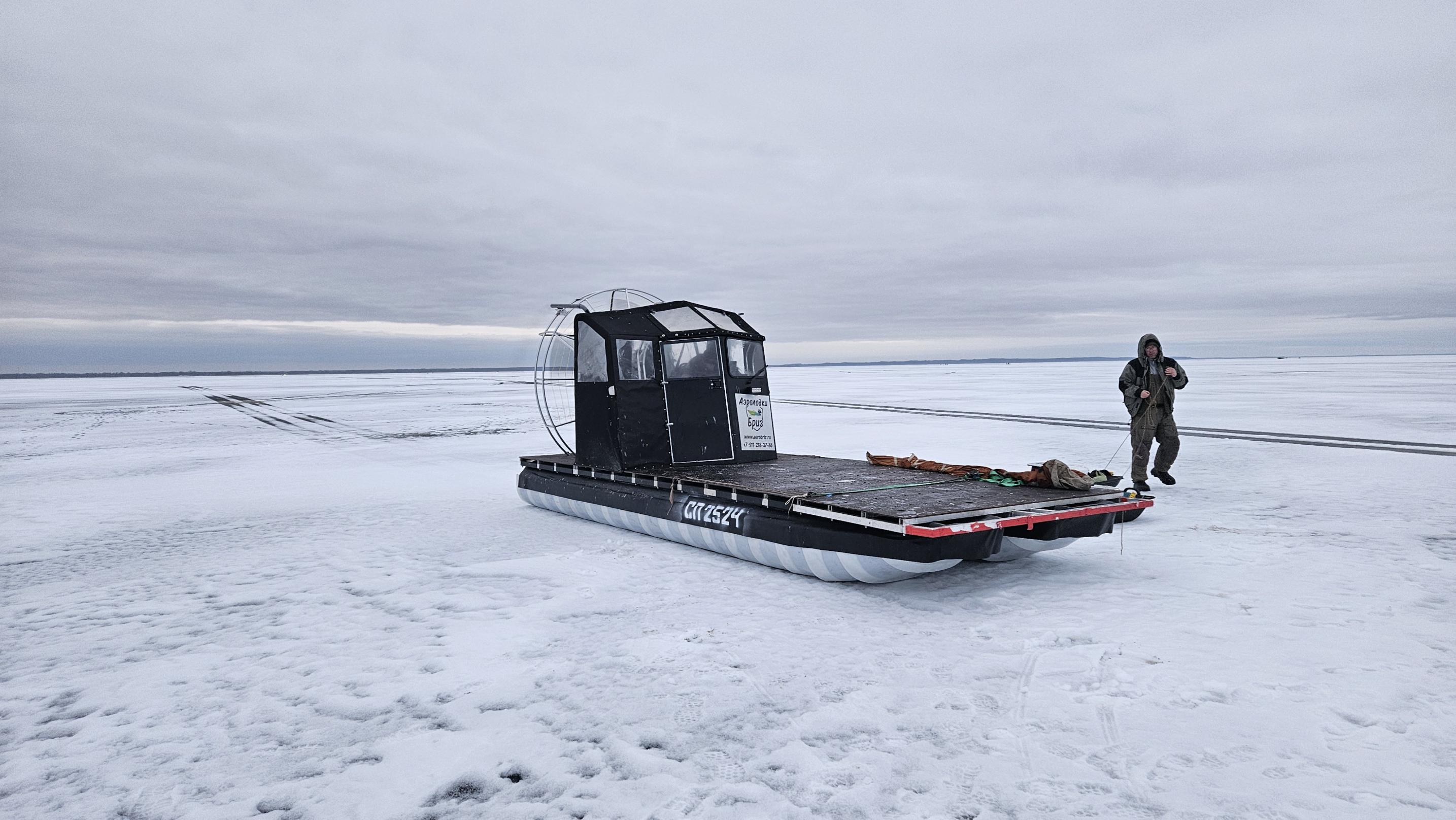 По дороге в Островцы надо 17 км преодолеть по гравейке. Гравейка бывает разбитой и не очень, в зависимости от размеров оттепели. В этом году дорога была приличная. Можно было местами ехать и 80 км.ч. На гравейке мы догнали машину с экипажем Палтус-Артур, что было удобно. Нашли место для двух машин в деревне, рядом запарковались и вышли на лед. На льду уже стояла толпа народа, человек 80, ждали начала развозки. Развозка началась с 8 утра. Все очень быстро и организованно. Рейс аэролодки занимает около 15 минут, не более, поэтому очередь шла быстро. Лодка по прикидкам едет по льду 50 км.ч. или около того.