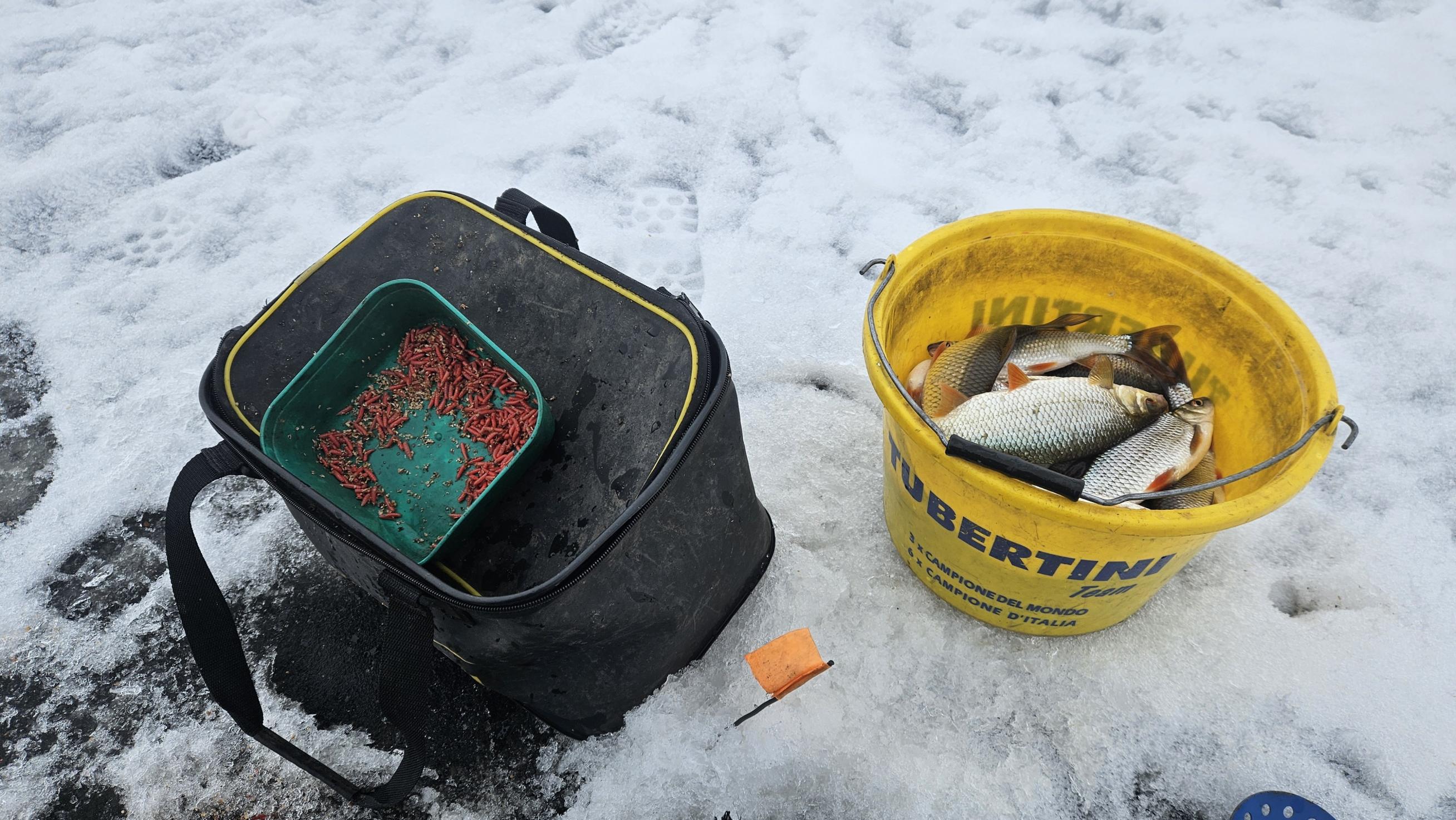 Вечером 28 февраля организовали праздничный ужин на базе, проводили зиму, но без фанатизма. Утром встали в 5 утра, сделали прикормку. Я делал микст две пачки сенсас гросс гардонв + две пачки вабик черная плотва. В прикормку добавляли много красного опарыша, нарезали консервированной кукурузы из банок. Ловля предполагалась только на опарыша, поскольку использование мотыля, даже крупного, увеличивает количество поклевок мелкой рыбы.