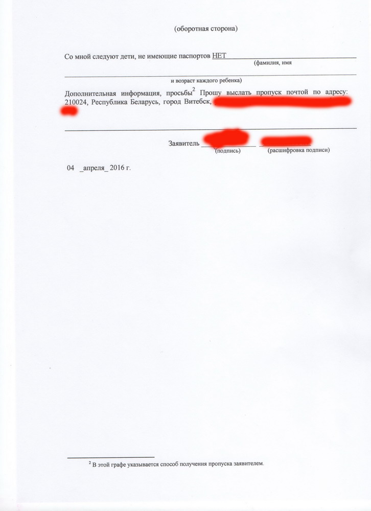 Также нужно приложить скан (или четкое фото) последнего(с фотографией) и предпоследнего(30-31 стр) разворота паспорта с фотографией .Всё! Пропуск должны прислать в течении 60 дней. Нам прислали раньше. Пропуск выдают на год ,с момента его подписания. [ATTACH=CONFIG]528360[/ATTACH][ATTACH=CONFIG]528361[/ATTACH]