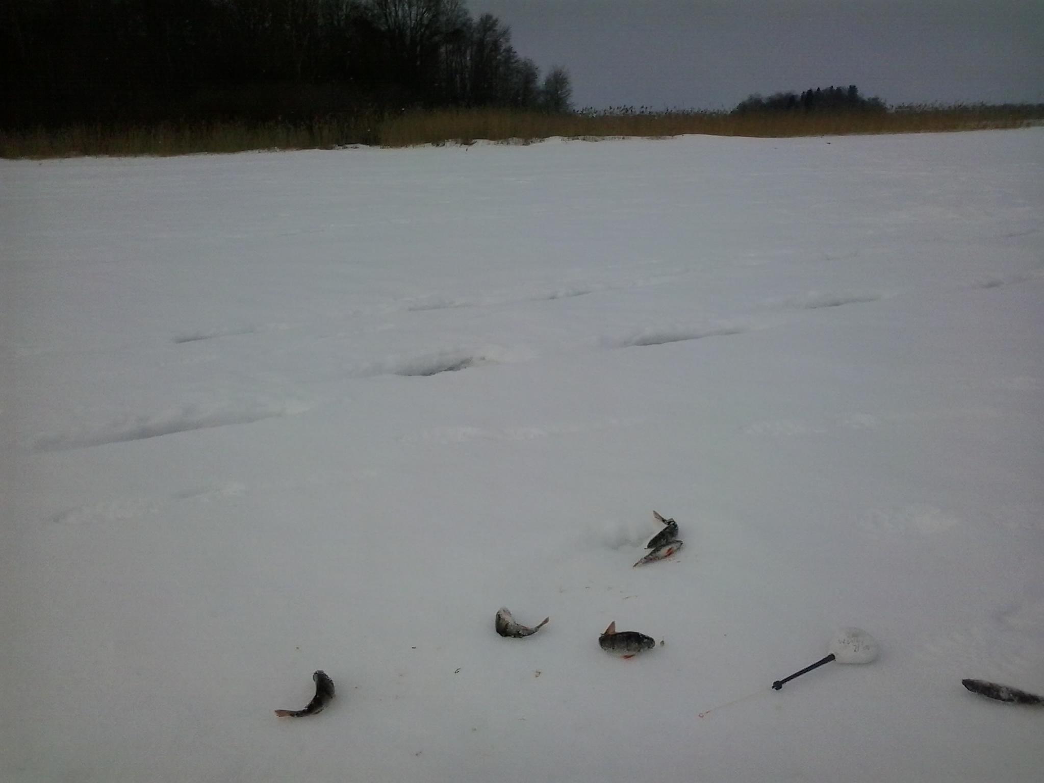 Брали с собой флажки, решили раз есть плотва выставляемся. Выставлятся ушли в берег метров 700 от нас. В итоге на 20 флагов 4 сработки. Щука основательно жевала живца (порезы, снятая чешуя), но на лед не собиралась...:D Это лучший результат, обычно у нас даже сработок не было на этом озере...:D:D:D