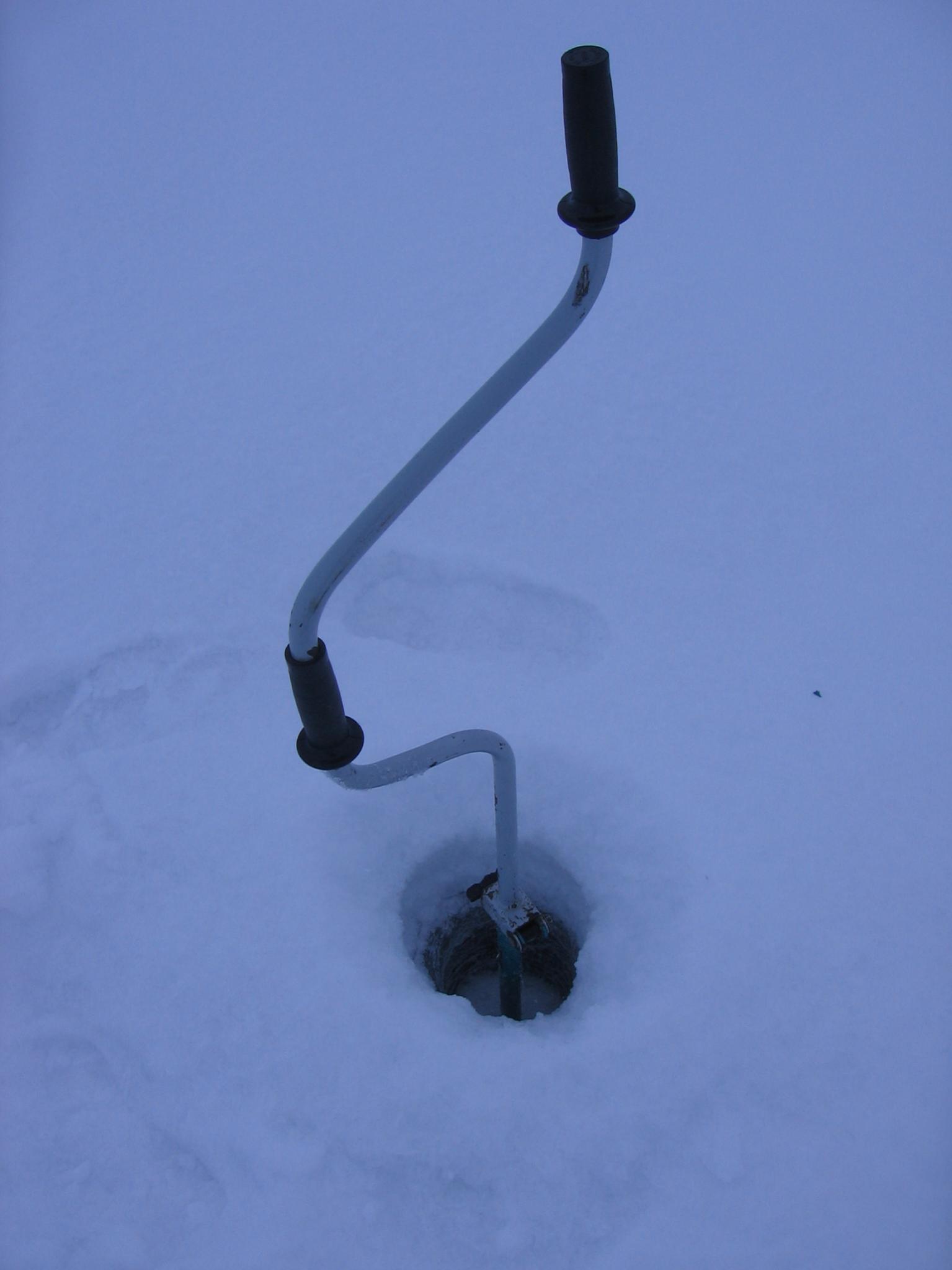 Первые 50-70 см сверлятся легко, потом бур начинает вязнуть. Приходится по нескольку раз выбрасывать шугу и досверливать на коленках… Лед около метра.
