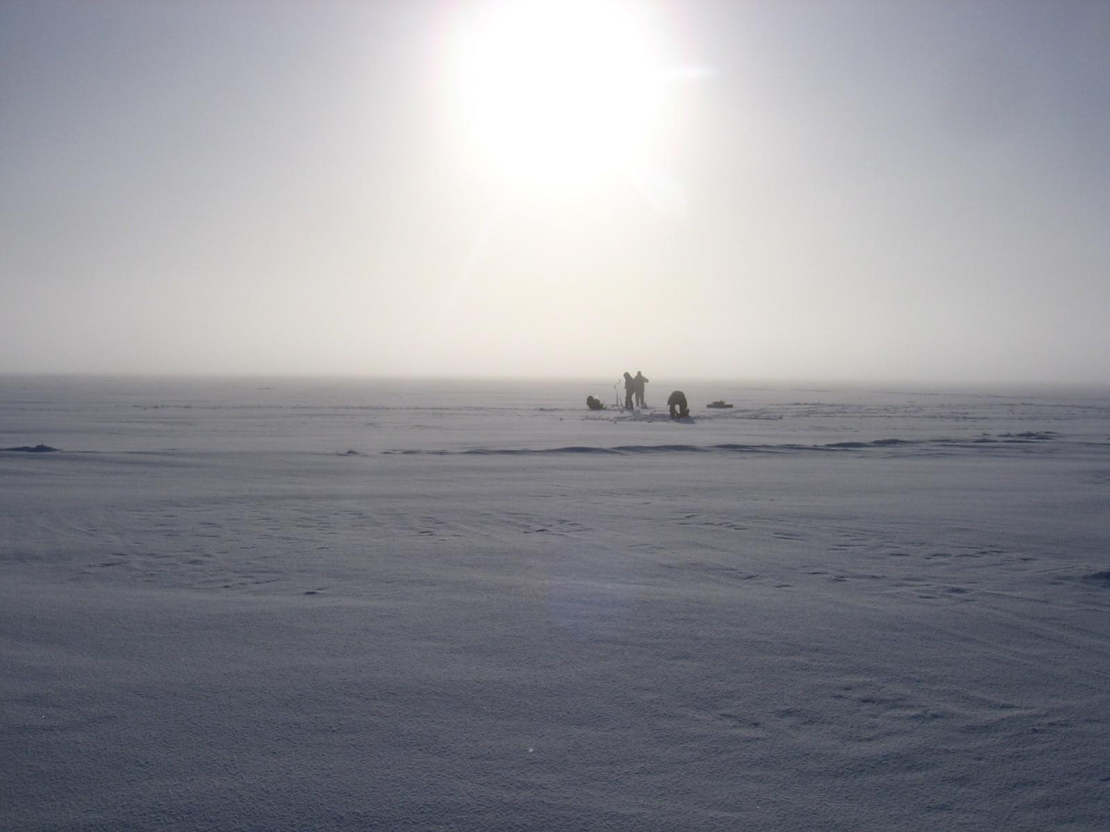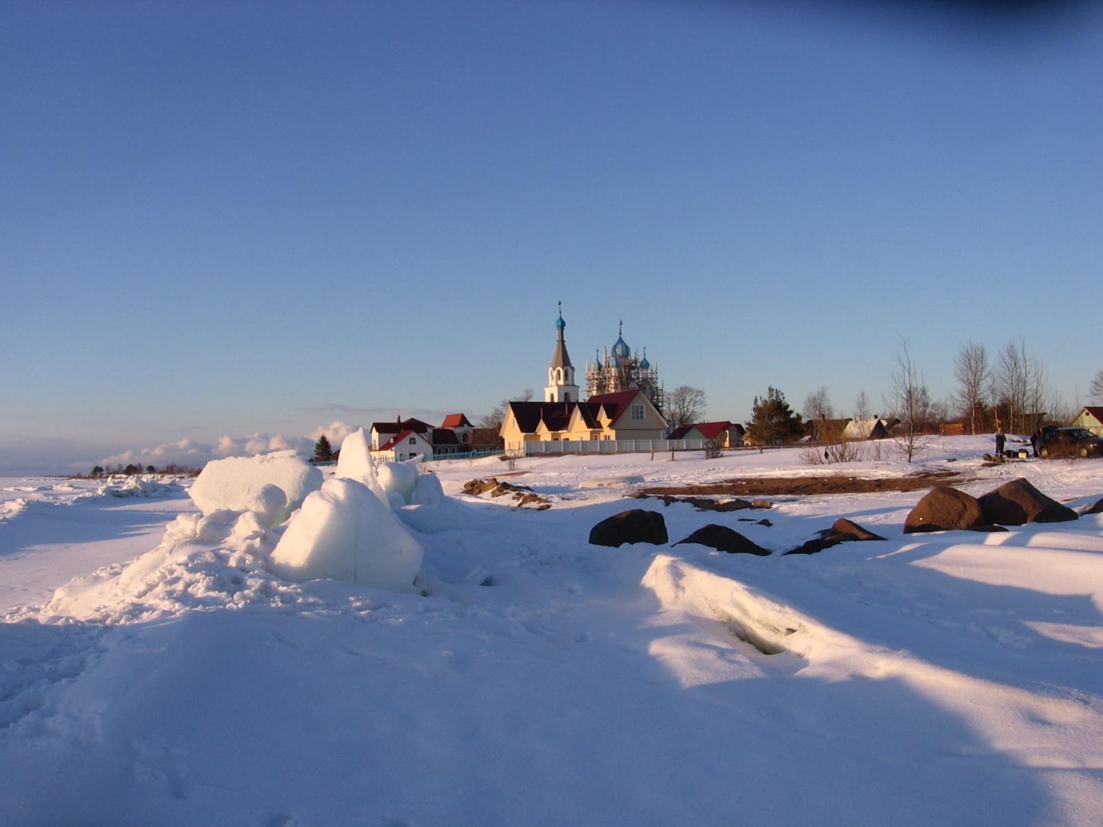 Не заметили, как завечерело. Позвонили «извозчикам». Они пьяные в дупель… Что ж, пройдемся пешочком. Церковь то – вот она, рукой подать. Снег довольно твердый, а если идти по следу от «бурана», то и вовсе как по асфальту. Зацепили санки, отягощенные 7-10 кг рыбки у каждого, поплелись до дому. Топ-топ…топ-топ… двадцать минут идем, а церковь все на том же расстоянии… Растерянный взгляд назад – а мы вообще прошли хоть сколько?Топ-топ… Не, не привычно топать 2.6 км по льду… Прогулка не то, что бы напрягла, но утомила. Поэтому твердо решили следующий день поменять немного денег на комфорт и проехать и туда и обратно.