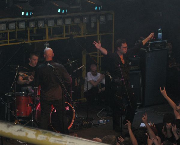 1,5 часа пролетели незаметно, было 2 бисса, за которых сыграли старые добрые хиты, и пел весь зал. Напрощание (якобы ;) ). музыканты многим пожали руки. А потом накупаешь кучу фирменной продукции и разводишь продавца на значок. Пулей покупаешь плакат, ибо музыканты сидят в баре, без проблем получаешь автографы, фотографируешься, благодарищь ребят и они тоже очень рады такому вниманию фанатов. Ну и напоследок поцеловать гитариста :)