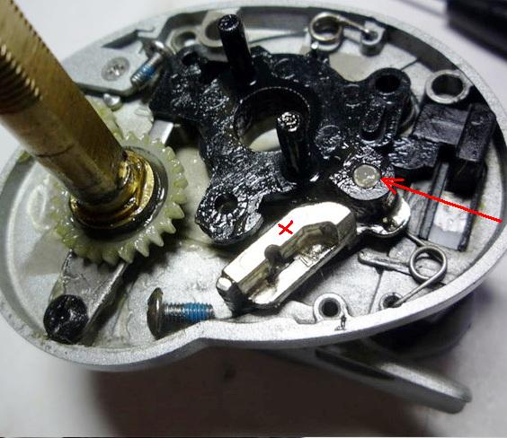 Нужно разбирать катушку. Рычаг (на фото я его пометил красным крестиком) заедает в месте указаном красной стрелкой. Нужно разобрать и круглым надфилем увеличть диаметр отверстия или наждачкой почисть шток. Есть мнение, что пластиковая деталь распухает от смазки и диаметр отверстия уменшается или просто грязь.Сообщение от boyko_7777 Посмотреть сообщениеМожет кто поможет- в абу гарсиа рево стх 3 генерации, бывает при забросе не возвращается клавиша разблокировки шпули