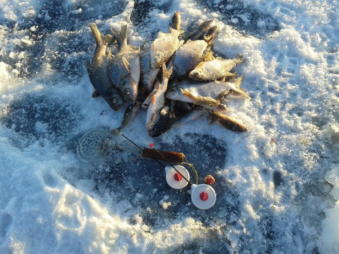 Ловля второго дня чуть чуть оживилась, хотя конечно очень слабо . В палатке поймал ещё одного небольшого подлещичка , а вот проверяя вчерашние закормленные лунки по площадЯм - с некоторых снял по подлещичку , и плоточка влетела . В итоге пару кило наковырял , семь подлещиков , плоточка и ершово - окунёвый суповой набор. Брат поймал пару подлещиков к своей щучке плюс мелочь , Иванович одного подлеца . Ставки срабатывали несколько раз , но щука там интеллигентная , размотает и кидает , если конечно не жор. Я свои ставки даже не брал с собой , а то постоянно на них косИть глазами придётся , да и в мороз повмерзают, потом отковыривай их пешнёй..