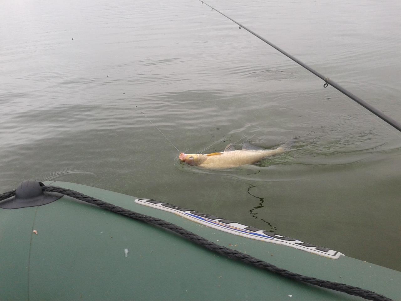 ровно в 8 первая выкладка......на мотыля.... и до 12 я не скучал. при затихании клева докорм....мотыль и мотыль с одним опариком.... кракены стояли на прикормке весь день,был перерыв с 12-до 14.....но он был рядом это точно.. пока была тишина,достал зимнюю вуду с леской 0.1 и опустил прямо под лодку....(утром я туда два шарика подкинул... мелкая густерка клевала исправно и отправлялась мимо садка......в общем не скучал.......но,это лишь подтвердило,что лещи крутятся над прикормкой и не дают мелочи даже подойти....к *столу*(на леща,всегда закармливаю обширный участок-примерно 1.5-2м в ширину и 5-6м в длину,чтоб было ему где задержаться) расстояние от лодки до поплавков 12-14 м... на поплавок попались лишь 4-5 мелких густерин за день..а под лодкой мелочи хватало:cool: