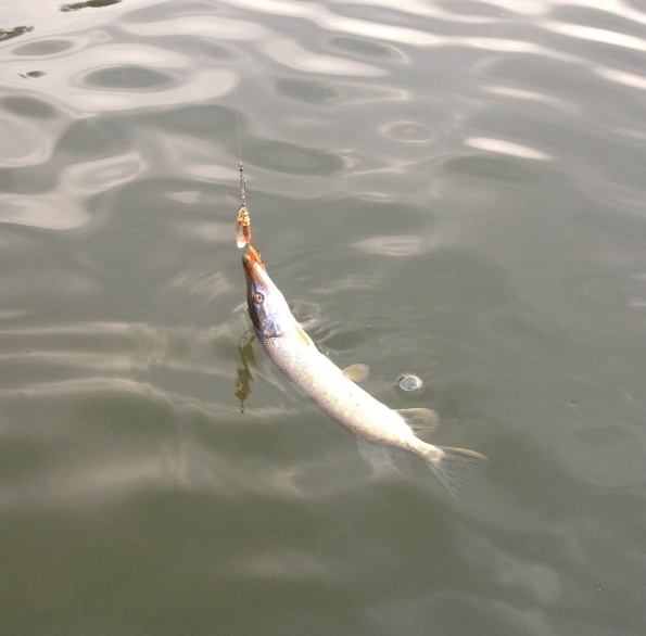 Кажется самое время наведаться в «огород». Есть у меня такое место, где подводная растительность растет практически правильно расставленными пучками, как "бураки" на грядке. Ведешь приманку между «грядок», а ее то и дело пытаются перехватить в планировании. Очередной проход и небольшой щуренок грызет обманщицу-жестянку, выглядевшую, на первый взгляд, так соблазнительно и аппетитно. Аккуратный вывод, чтобы обойти манящую, кажущейся ей свободой, травку, персональная фотосессия, осмотр ранений.