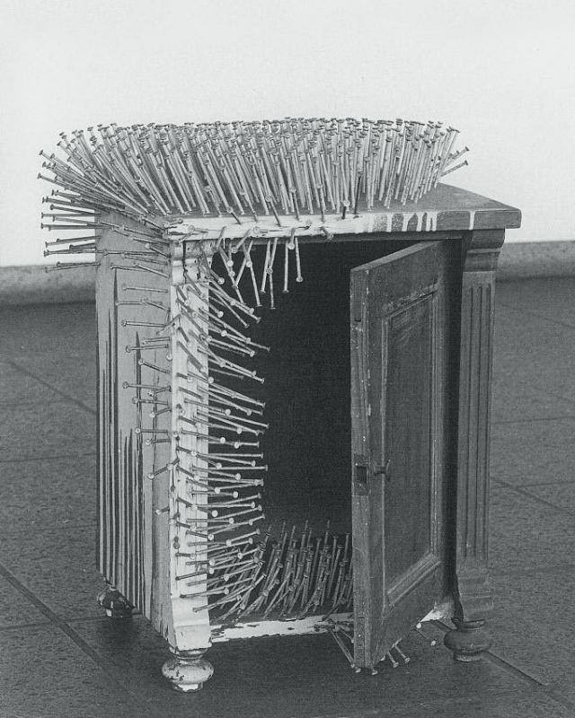 . ...2 года до этого я был в Москве. Гулял себе, получал удовольствие. И как-то неожиданно забрёл на выставку современного искусства. Там была выставка западногерманского художника-супрематиста Гюнтера Юккера. Его искусство заключалось в том, что он во всё что видел, забивал гвозди, и в больших количествах. Гвозди в шкафу, стульях, телевизоре, швабре. Гвоздь в его понимании был – символ насилия… так он видел.... Молоток эдакий.