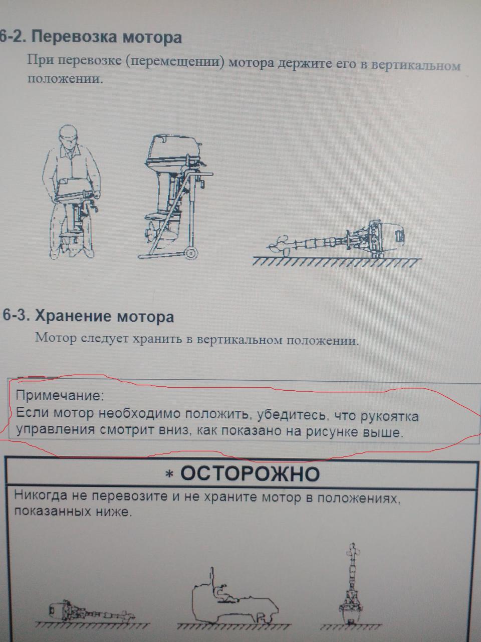 Вот наклейка на самом моторе как надо перевозить. На румпеле нельзя. Кстати при покупке двигателя я его перевозил тоже как на рисунке - в итоге масло начало вытекать из карбюратора. Пришлось потом промывать карбюратора. После этого перевозил в основном только вертикально.