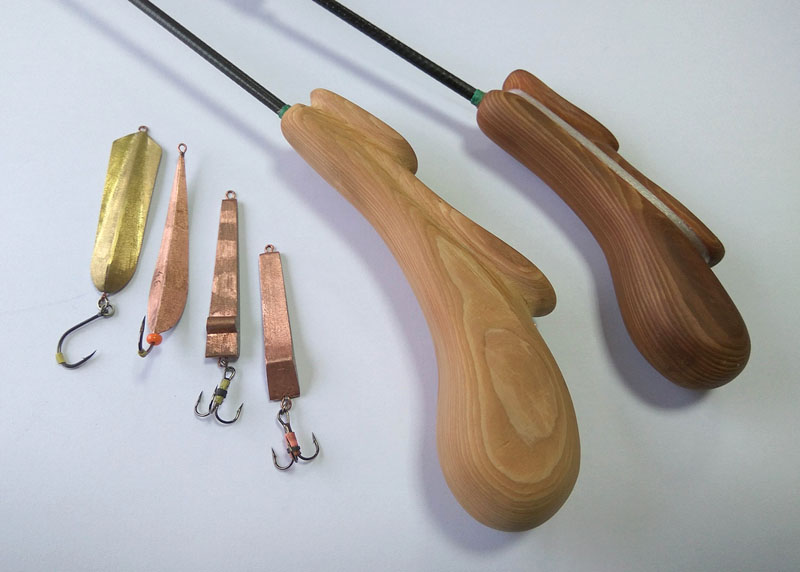 а для удобства транспортировки делаю складни-телескопы, любыми блеснами длинным хлыстом работать удобно, дело привычки. не люблю стоять согнувшись над лункой, и сидеть при блеснении не сижу, ловлю стоя. в ветер тюльпан длинного удильника ближе у лунке, леса меньше путается.