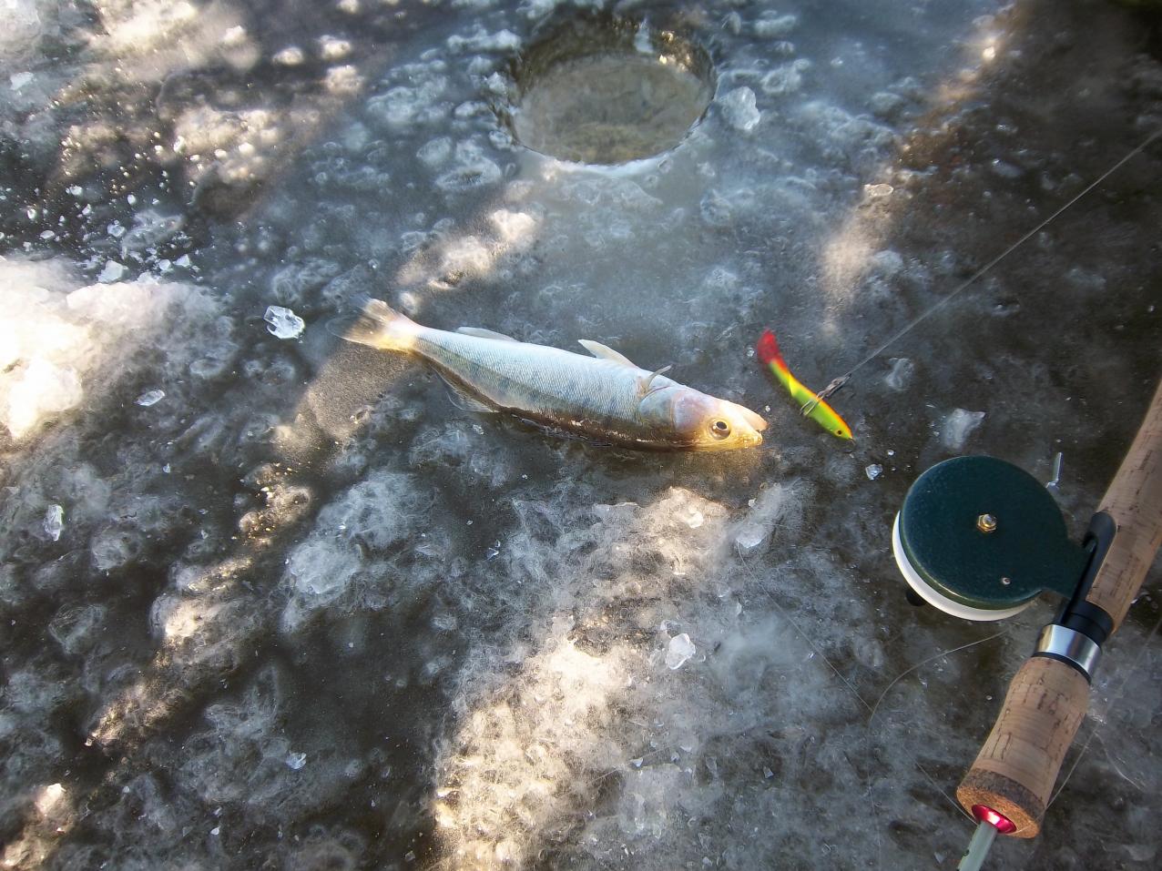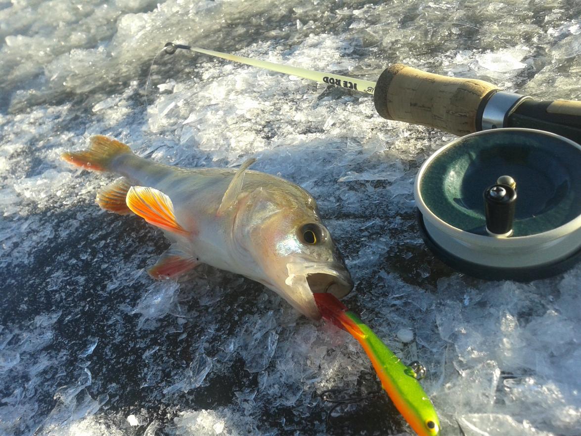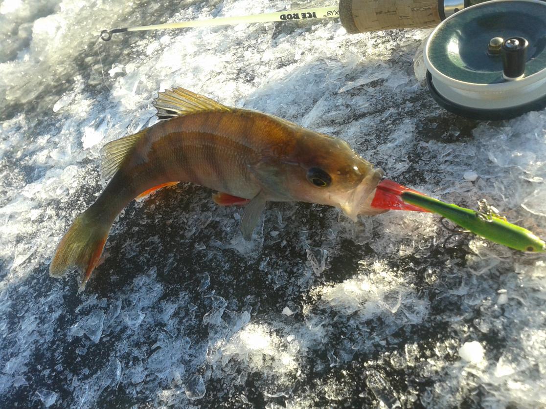 Все элементарно- любые касания приманки передаются в руку за счет жесткого хлыста. Ну а подбросы видны по леске. Во-вторник на этот удильник изловил 2-х детенышей судака. Один из них просто нюхал приманку, и это шевеление я почувствовал рукой. Второй сперва подбросил балансир, но судачок не засекся. Через 30 сек. подброс балансира и я его засек. Затем я пошел на лунки, где клевал окунь. И настебал полосатиков от 50 до 150 грамм. Все без кивка, все поклевки в руку........