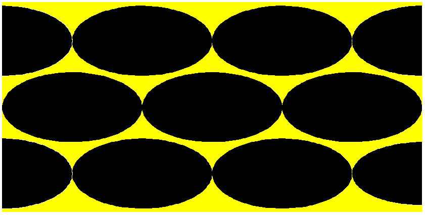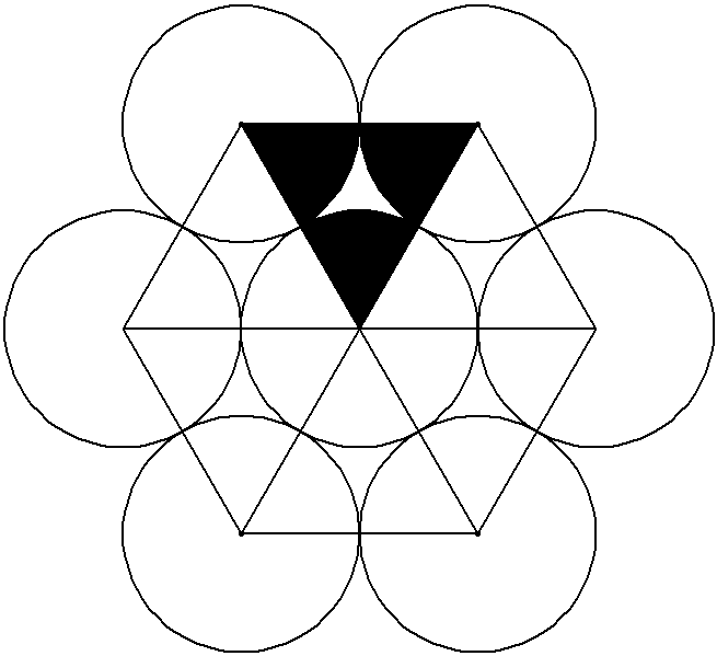 Площадь дырки = площадь треугольника минус три площади чёрных сектора окружности (половина площади окружности). Это составит 9.31% от площади треугольника. Треугольниками при самой плотной упаковке можно уложить всё сечение нити. На самом деле плотность упаковки ниже, поскольку требуются щели для протекания связующего в объём нити, т.е. площадь дырок будет не менее 10%.