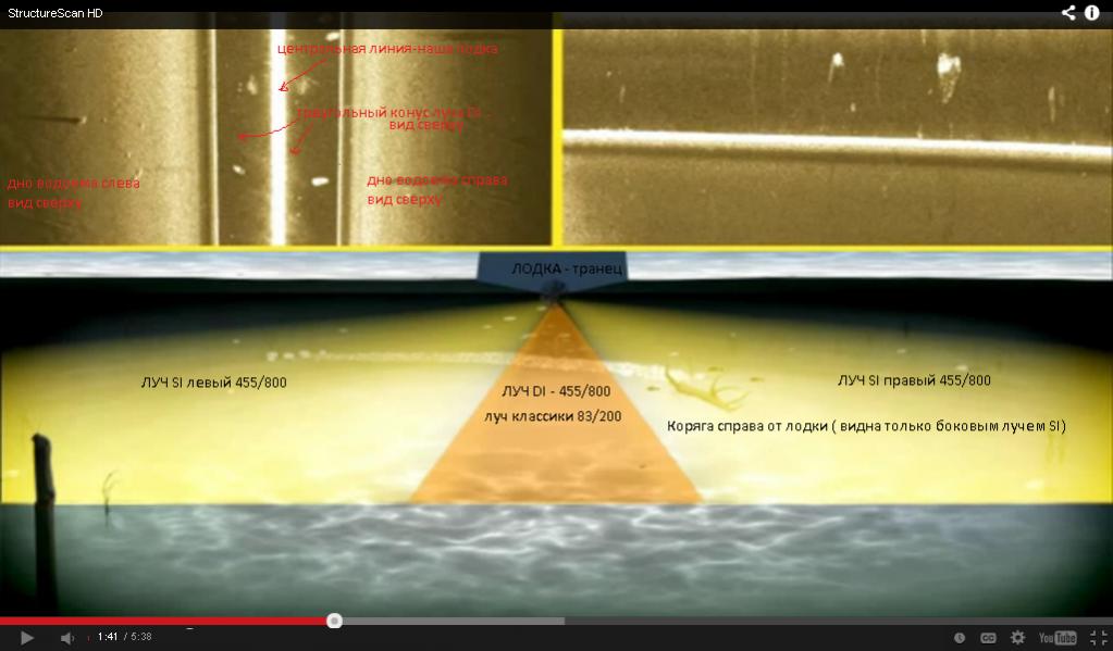 Теперь смотрим на луч 800кгц - он плоский, как долька апельсина поперек лодки. Такой луч без движения практически слепой. Один взмах веслами и все меняется - теперь (в движении) недостаток превращается в картинку высокой четкости. Вот и не подходит dsi т.к. белую рыбу или зимой в лунке мы ловим в статике.